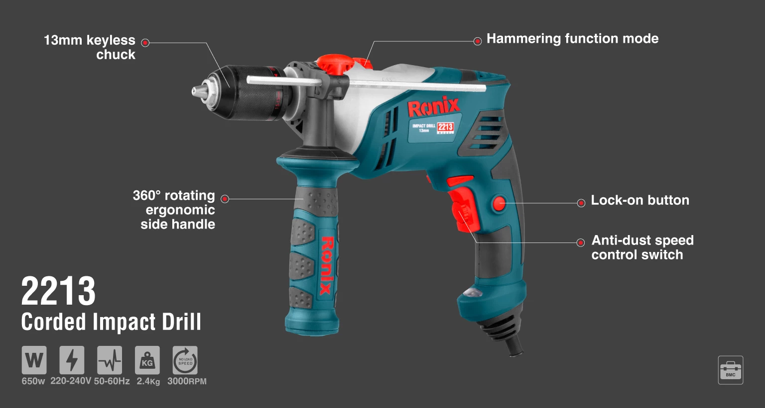 دریل برقی چکشی 2213 رونیکس، دارای موتور 650 وات و متشکل از آرمیچر و بالشتکهای صنعتی است که با دستگاههای تمام اتوماتیک ساخته شده و از قدرت و مداومت کاری بالایی برخوردار است. این موتور پرقدرت، سرعتی بالغ بر 3000 دور در دقیقه را ایجاد میکند تا دریل بتواند با ضربات چکشی به مواد و مصالح چوبی، بتنی و فلزی نفوذ کند. افزونبراین، دارای سهنظام 13 میلیمتر اتوماتیک است و برای تعویض مته نیازی به آچار ندارد. در نتیجه، میتوانید به سادگی در میان کار متهها را تعویض کرده و به فعالیت خود ادامه دهید.