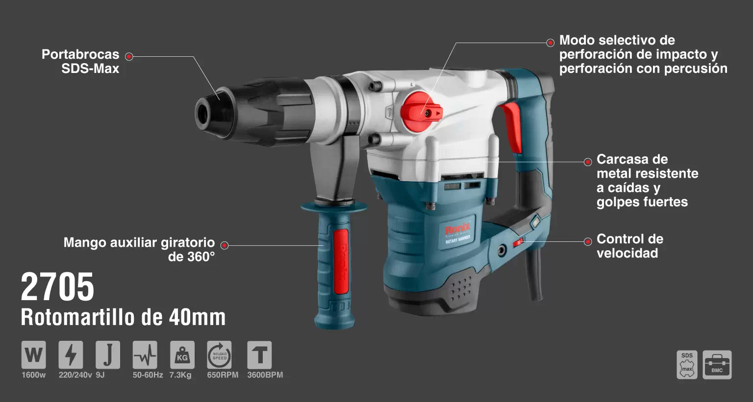 سرعت تولید شده توسط موتور و توان ضربه 9 ژول، امکان نفوذ مته تا عمق 40 میلی متر در بتن را برای این دستگاه فراهم میکند. وجود بلبرینگ های ضدغبار NSK نیز باعث افزایش طول عمر مفید موتور شده و مولدی ایده آل برای انجام دو عمل مجزای سوراخکاری چکشی و تخریب ساخته است. بتن کنها مجهز به سیستم ابزارگیر SDS هستند که یک سیستم ابزارگیر سریع می باشد و برای انجام کارهای سنگین تر مورد استفاده قرار میگیرد. مزیت مکانیزم SDS این است که میتواند مته های بزرگتری را با قطر بیشتر نگه دارد بنابراین برای حفاری و سوراخکاری های سنگین تر از دریل هایی با این مکانیزم استفاده میشود. دریل بتن کن 40 میلی متری 2705 مجهز به سیستم ابزارگیر SDS-MAX یا پنج شیار است که میتواند مته هایی با قطر 40 میلی متر را ثابت نگه دارد و موجب افزایش تاثیر عملکرد این محصول شود. بتن کن 40 میلی متری 2705 رونیکس دارای طراحی منحصربفردی است که با وزن کم و سیستم ضدلرزش دوبل AVS در دسته، موجب دستیابی به کنترل بیشتر روی دستگاه برای کاربر میشود.