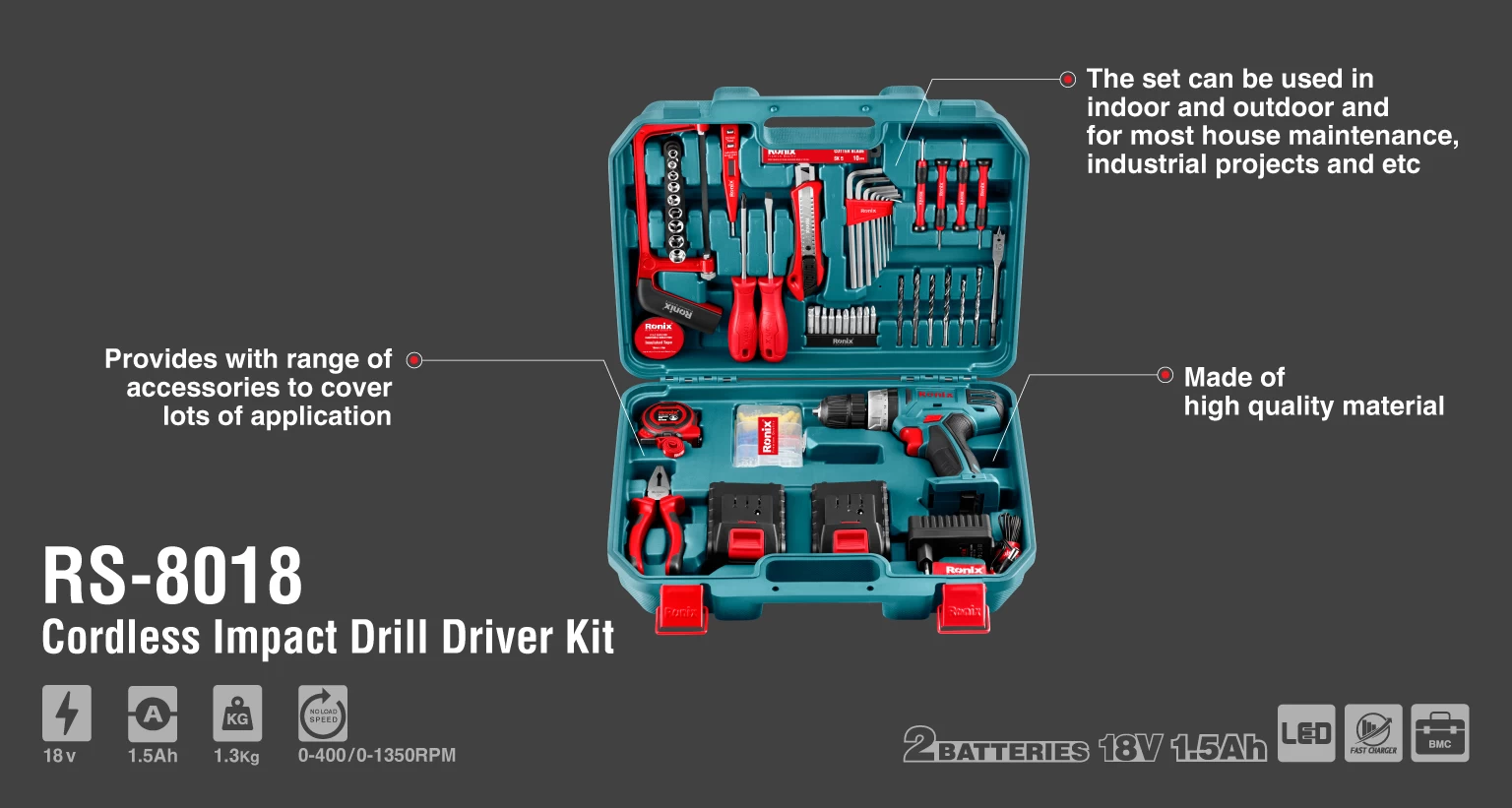 در این ست ترکیبی، دریل پیچگوشتی چکشی شارژی 18 ولت رونیکس مدل 8018 گنجانده شده است که انتخابی تمامعیار با ویژگیها و مزایای ممتاز یک ابزار شارژی قدرتمند محسوب میشود.