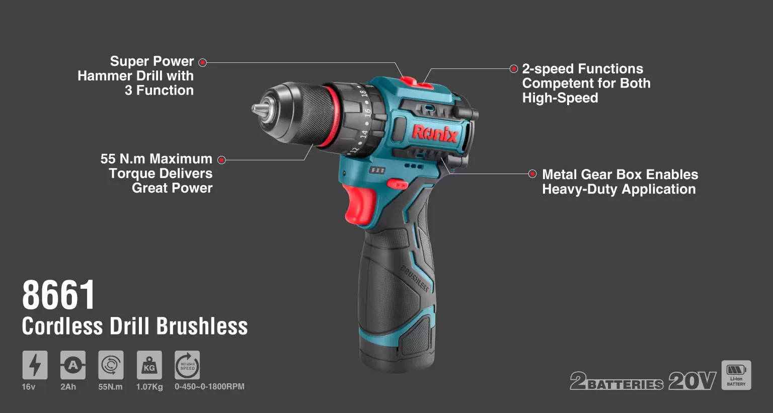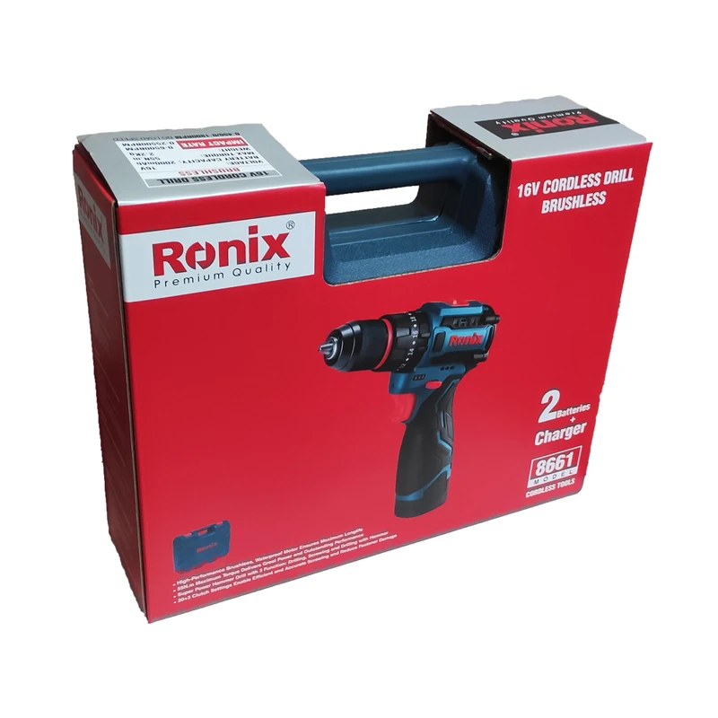 دریل پیچ گوشتی کامپکت 8661 رونیکس در یک کیف BMC مقاوم به ضربه همراه با یک جفت باتری لیتیوم- یونی 16 ولت و یک فست شارژر به بازار ابزار ایران عرضه میشود.