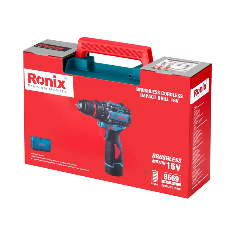 دریل شارژی براشلس 16 ولتی رونیکس مدل 8669 در یک کیف BMC مقاوم به همراه 2 عدد باتری و یک عدد شارژر تولید و به بازار عرضه شده است.