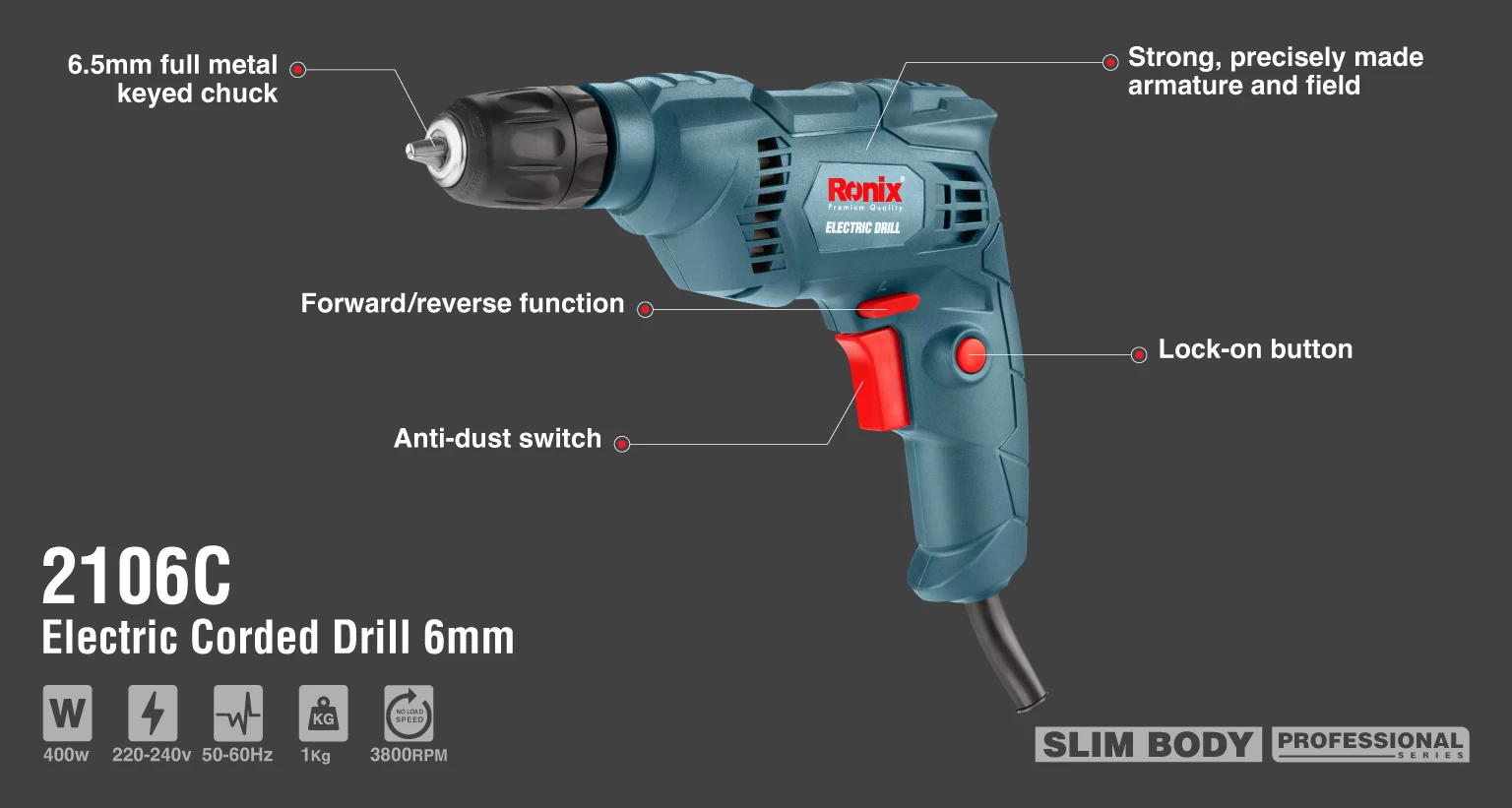 برای آشنایی بیشتر با دریل برقی 6 میلیمتری اتوماتیک 3800 دور رونیکس مدل 2106C، در بخش توضیحات محصول با ما همراه باشید.