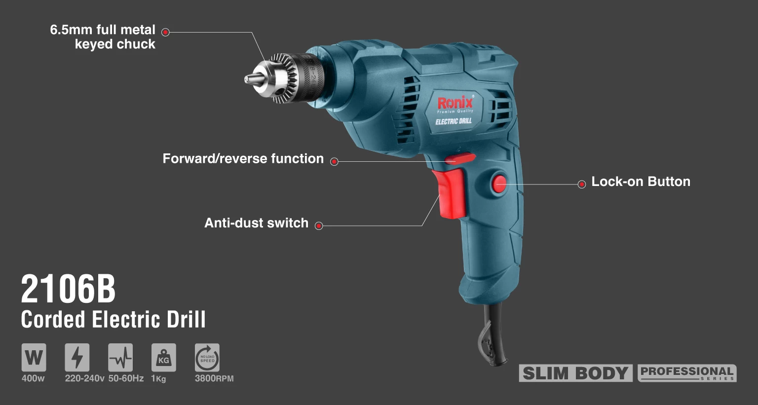 دریل برقی 6.5 میلیمتری 400 وات 3800 دور رونیکس مدل 2106B از کیفیت ساخت بالا، دوام زیاد و کاربری خارقالعادهای در طول مداومتهای کاری برخوردار است.