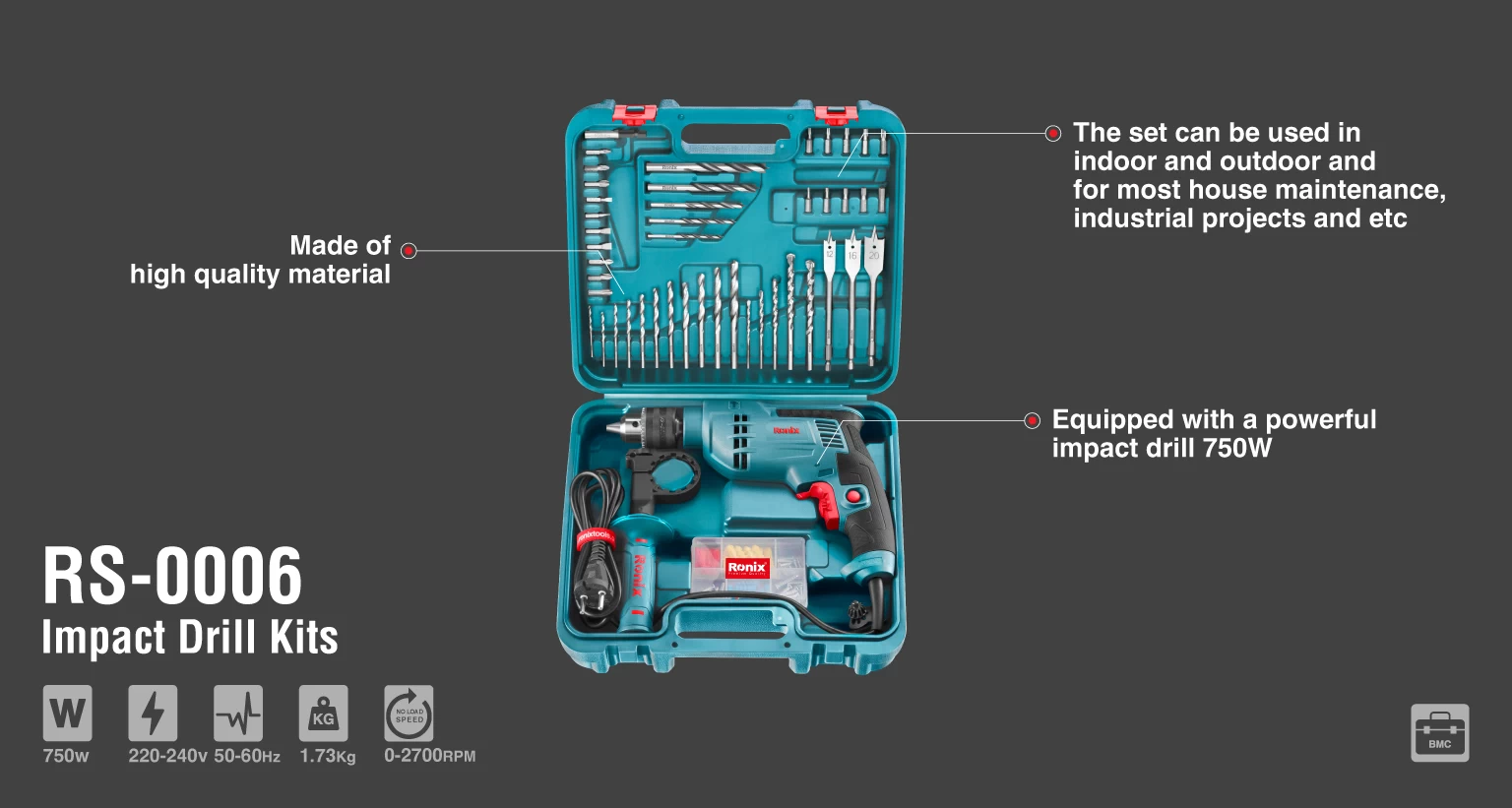 ست ترکیبی دریل برقی رونیکس مدل RS-0006، دارای 52 عدد ابزار و متعلقات کاربردی است که در کیف BMC ضد ضربه رونیکس به بازار ابزار ایران و جهان عرضه میشود.