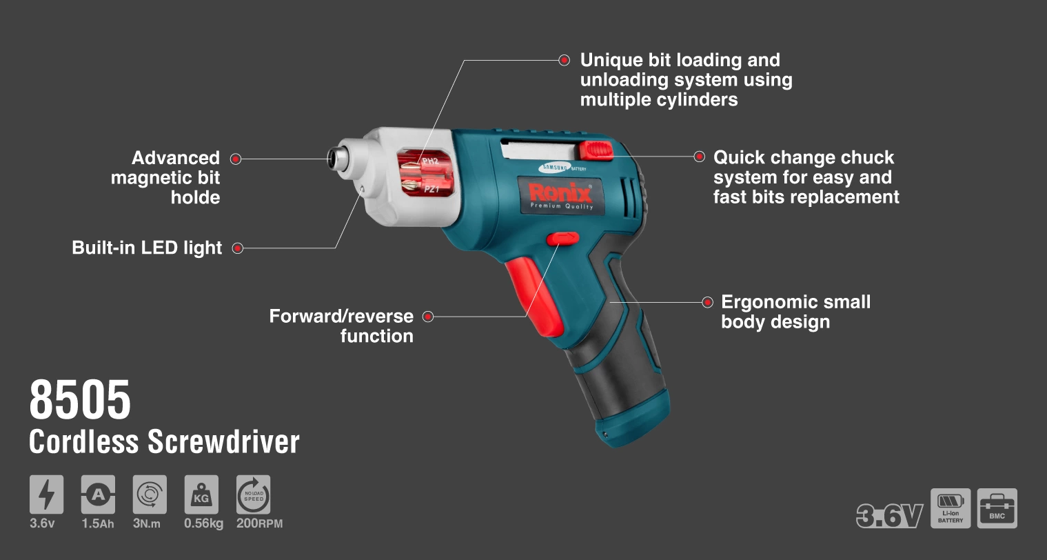 از جمله ویژگی های پیچ گوشتی شارژی رونیکس مدل 8505، می توان به نشانگر میزان شارژ باتری، گشتاور 3 نیوتن متری و برخورداری از انواع سر پیچ گوشتی اشاره کرد.