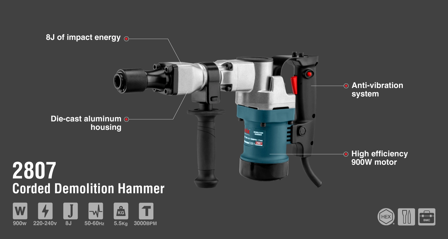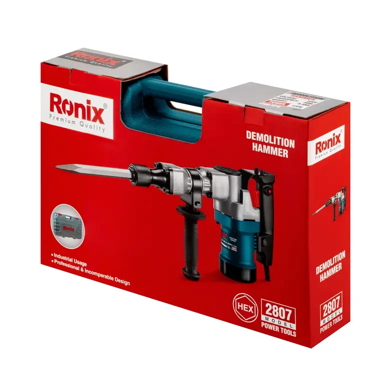 رونیکس مدلهای مختلف چکش تخریب را تولید میکند. چکش تخریب 6 کیلویی 2807 رونیکس، یکی از نمونههای باکیفیت این مجموعه، مجهز به یک موتور قدرتمند 900 واتی است. توان ضربه این چکش تخریب، بالغ بر 8 ژول و نرخ ضربه آن 2900 ضربه بر دقیقه است.