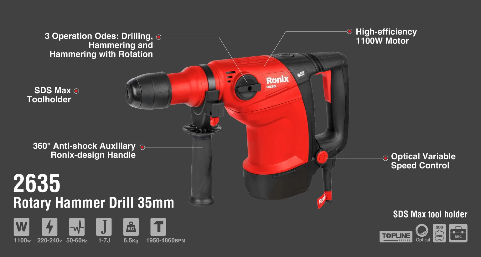 دریل بتنکن 2635 از مجموعه بتنکنهای تاپ لاین رونیکس، مجهز به یک موتور قدرتمند 1100 وات است که از آرمیچر و بالشتکهای فوق صنعتی با کیفیت ساخت بسیار بالا ساخته شده است. طراحی ویژهی بدنه و دسته در این بتنکن، موجب سهولت استفاده، حداقل لرزش و کنترل بیشتر دستگاه میشود.