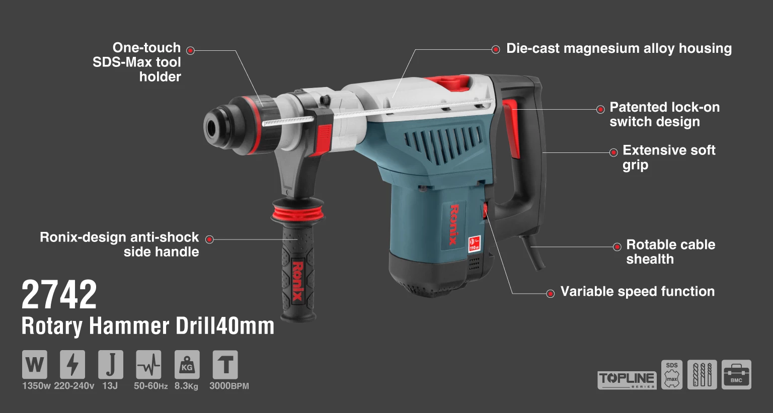 بتنکن 8.3 کیلوگرمی رونیکس مدل 2742، مجهز به یک موتور قدرتمند 1350 وات و با بازدهی بالا در دو عملکرد سوراخکاری و سوراخکاری چکشی است. سیستم تخریب سریع این بتنکن، قابل مقایسه با سوپربرندهای جهانی بوده و سرعت آن در حالت آزاد در محدوده 516-150 دور بر دقیقه قرار دارد.