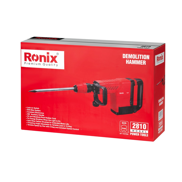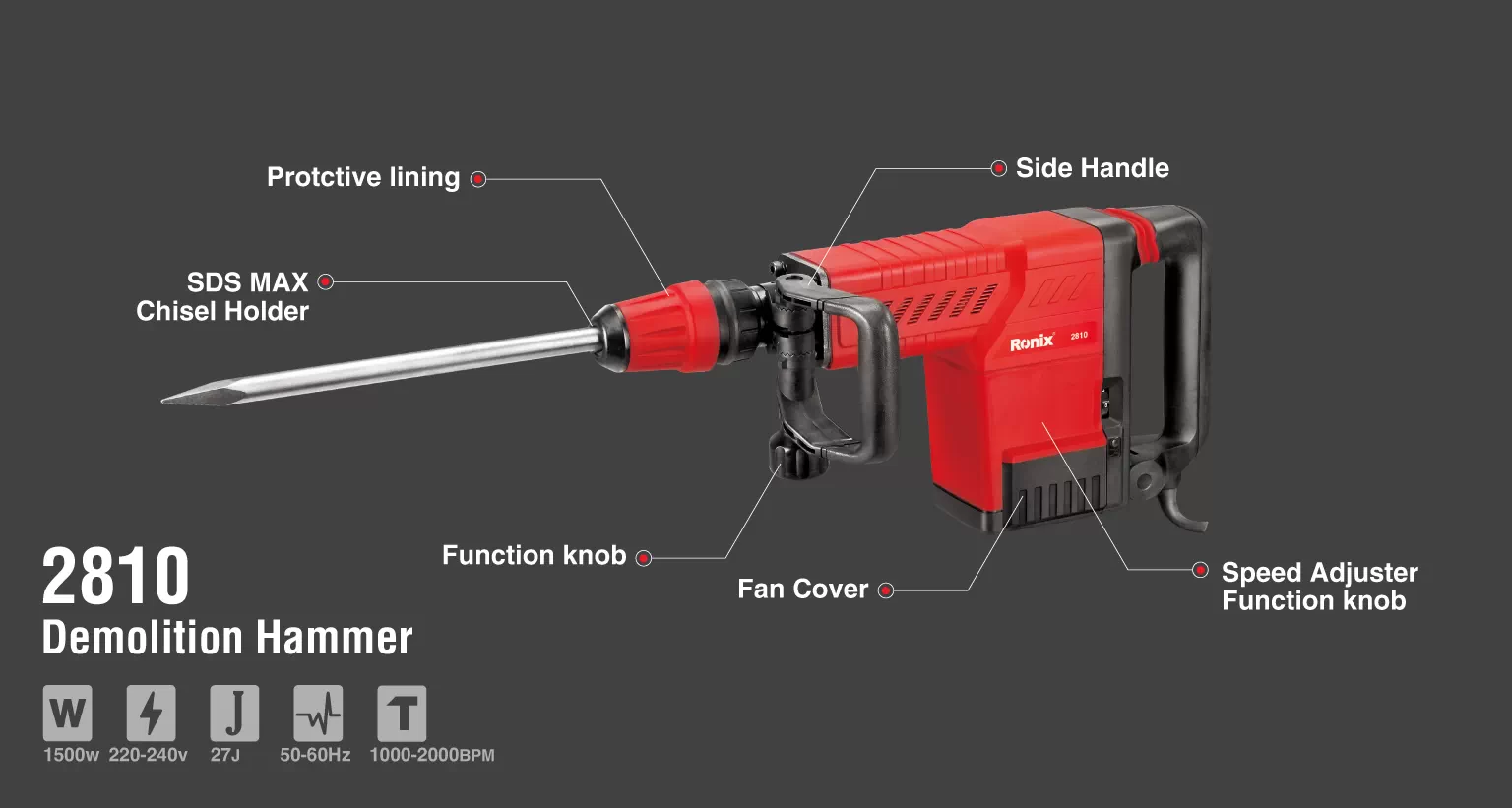 چکش تخریب فوق صنعتی 2810 رونیکس، مجهز به موتور قدرتمند ضد غبار 1500 وات و متشکل از آرمیچر و بالشتک صنعتی با کیفیت فوقالعاده بالا است. توان ضربهی بالغ بر 25 ژول باعث میشود که متهی ابزار به راحتی در بتن و سایر مصالح سخت و متراکم نفوذ کند. قدرت تخریب در این محصول فوق صنعتی رونیکس، به واسطهی وجود این موتور به بالاترین حد خود رسیده است.