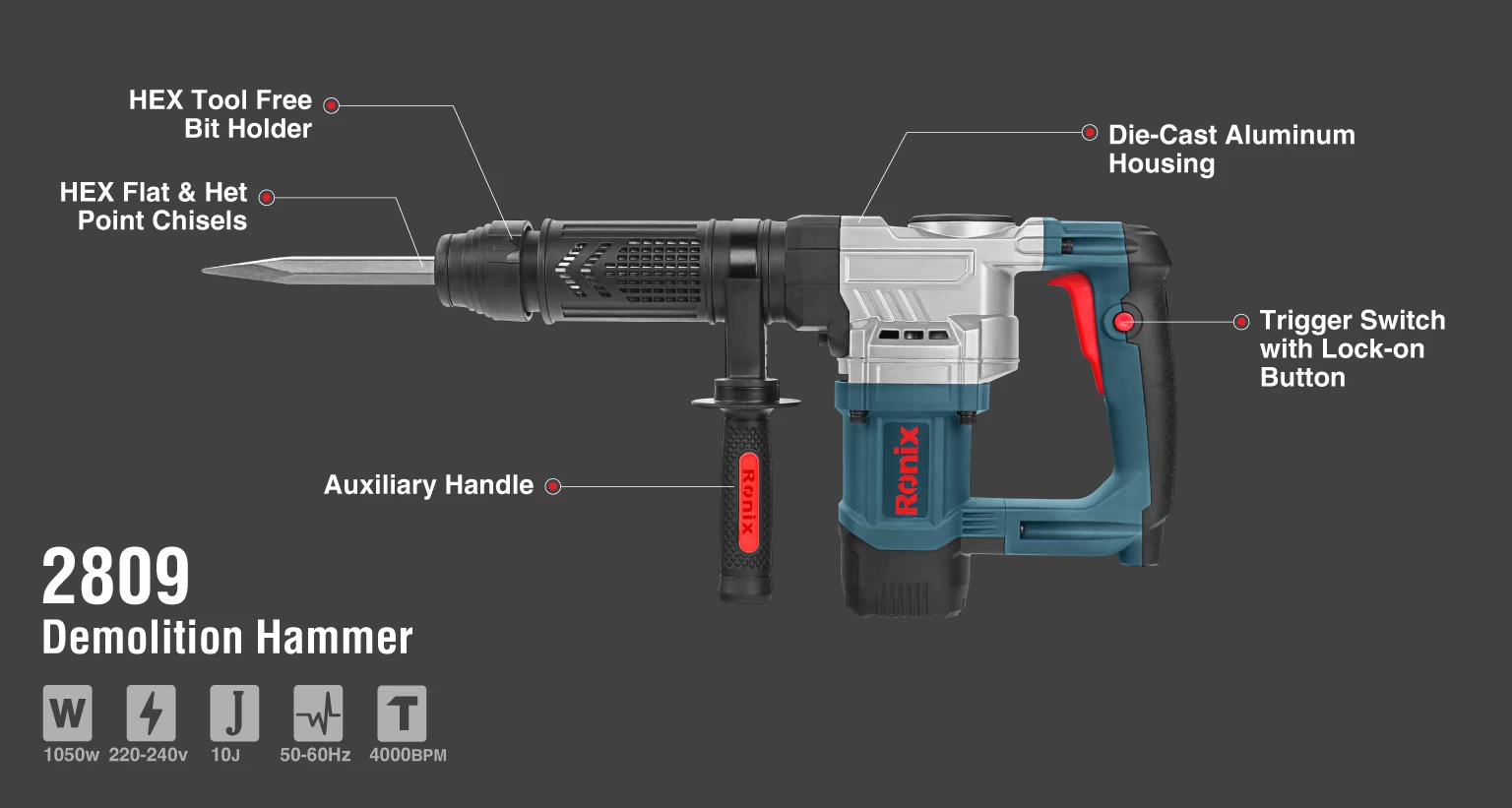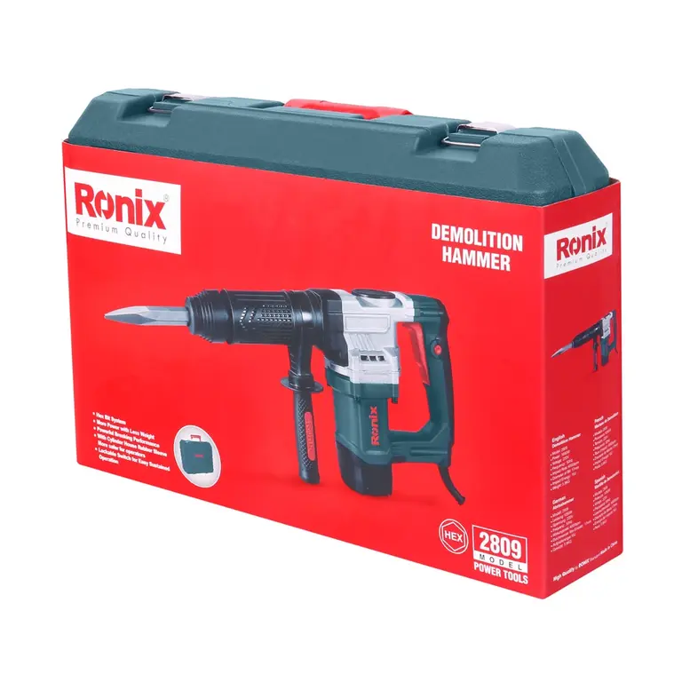 در امور ساختمانی، چکش تخریبی با قدرت مناسب در کنار قابلیت مانور پذیری بالا از نیازهای همیشگی بوده و چکش تخریب 6 کیلویی 2809 رونیکس با دقت و تمرکز بر این موضوع طراحی و تولید شده است. کافی است کلید ضد غبار آن را فشار دهید تا موتور 1050 واتی آن با انتقال قدرت به بخش شاتون و پیستون، توان ضربه قدرتمند 10 ژولی را با 4000 ضربه در دقیقه به سیستم قلم گیر شش گوش HEX با قابلیت پشتیبانی از انواع قلم تا سایز 17 میلی متر انتقال داده و به راحتی از پس تخریب مصالح برآمده و آن را به ابزاری همه فن حریف در تخریب بدل کند. همچنین وزن 6.5 کیلوگرمی این چکش تخریب در کنار طراحی ارگونومیک بدنه به صورت افقی، قسمت اتصال کابل برق به دستگاه به صورت کروی، بیشترین میزان مانور پذیری و کاهش چشمگیر استهلاک کابل را ارائه می کند و دسته های آنتی شوک از خستگی دست کاربر در حین عملیات پرفشار تخریب جلوگیری کرده و پروسه تخریب را سرعت می بخشد.