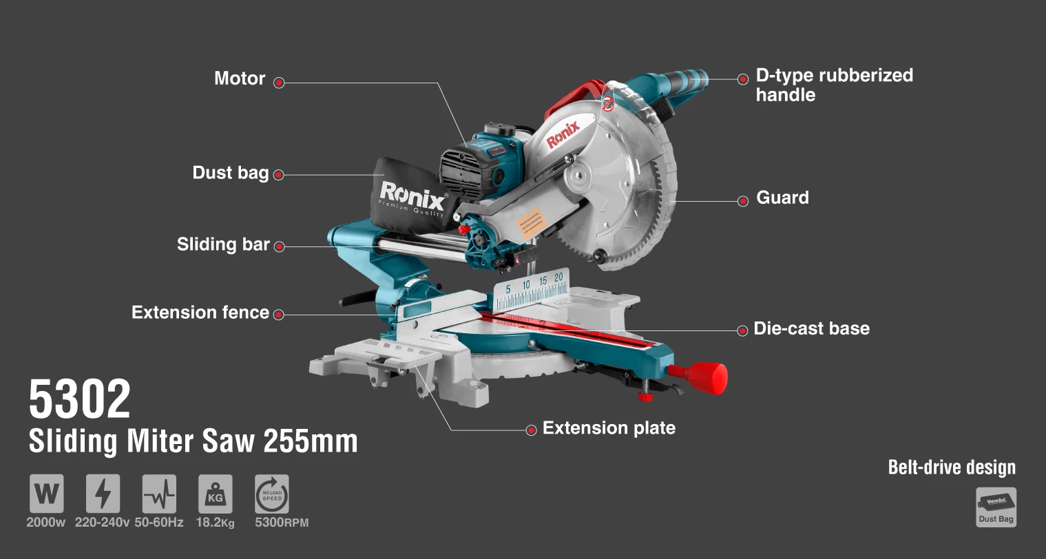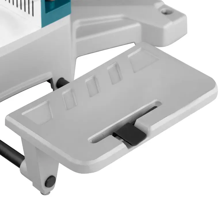 طراحی ارگونومیک، کمحجم و جمع و جور، سبک به وزن 18.2 کیلوگرم، قابل حمل و جابهجایی؛ ساخته شده از مواد باکیفیت بالا جهت افزایش کارایی ابزار؛ مجهز به ریلهای کشویی به منظور افزایش ظرفیت برشکاری؛ صفحهی عریضشونده جهت انجام برشهای متوالی در قطعات بلند الوار و MDF؛ خط لیزر برای افزایش دقت برشکاری؛ دستهی D شکل افقی جهت سهولت انجام عملیات برشی