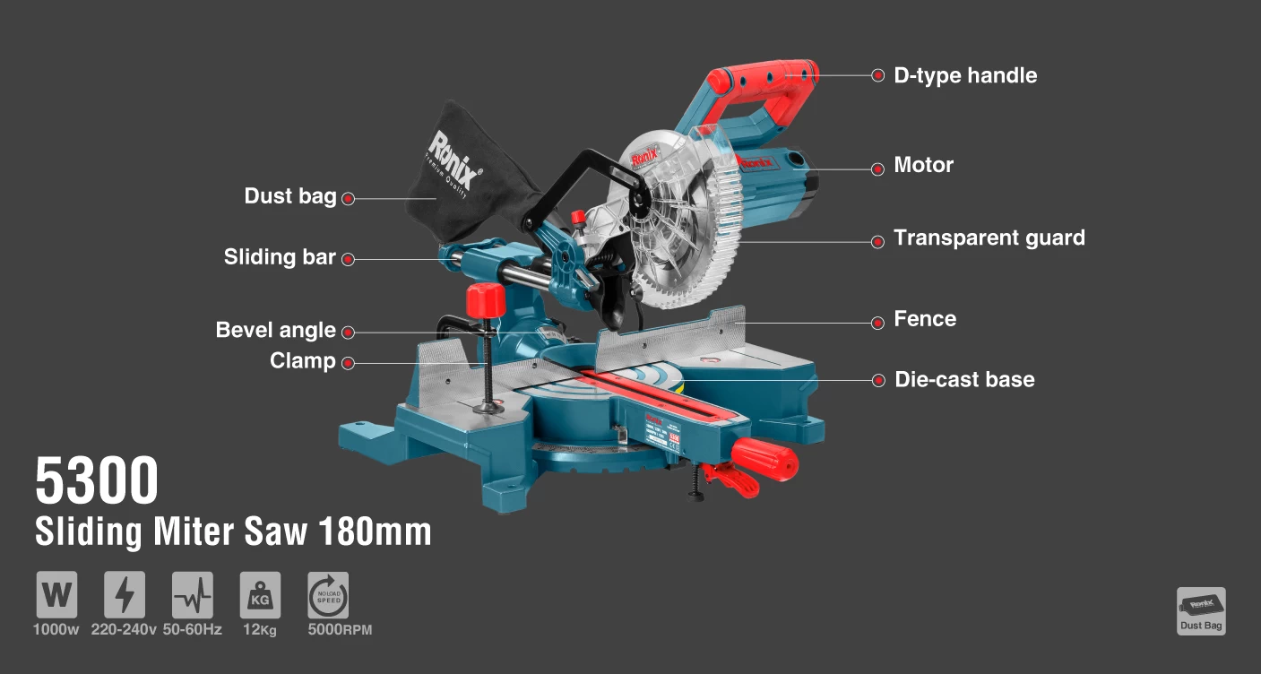 فارسیبرهای کشویی رونیکس از معتبرترین و باکیفیتترین ابزارهای قدرتمند برش در نجاری و صنعت چوب هستند. توان تولیدی موتور قدرتمند فارسیبر کشویی 5300 رونیکس، 1000 وات واقعی است که با توجه به قطر تیغه، توان مناسبی است. سرعت گردش در حالت آزاد نیز بالغ بر 5000 دور بر دقیقه است که صرف چرخاندن تیغهی برش 180میلیمتری این ابزار میشود. قابلیت تنظیم زاویه در دو محور امکانپذیر است: محور کفی از دو سمت تا °47 و محور بازویی از یک سمت تا °45.