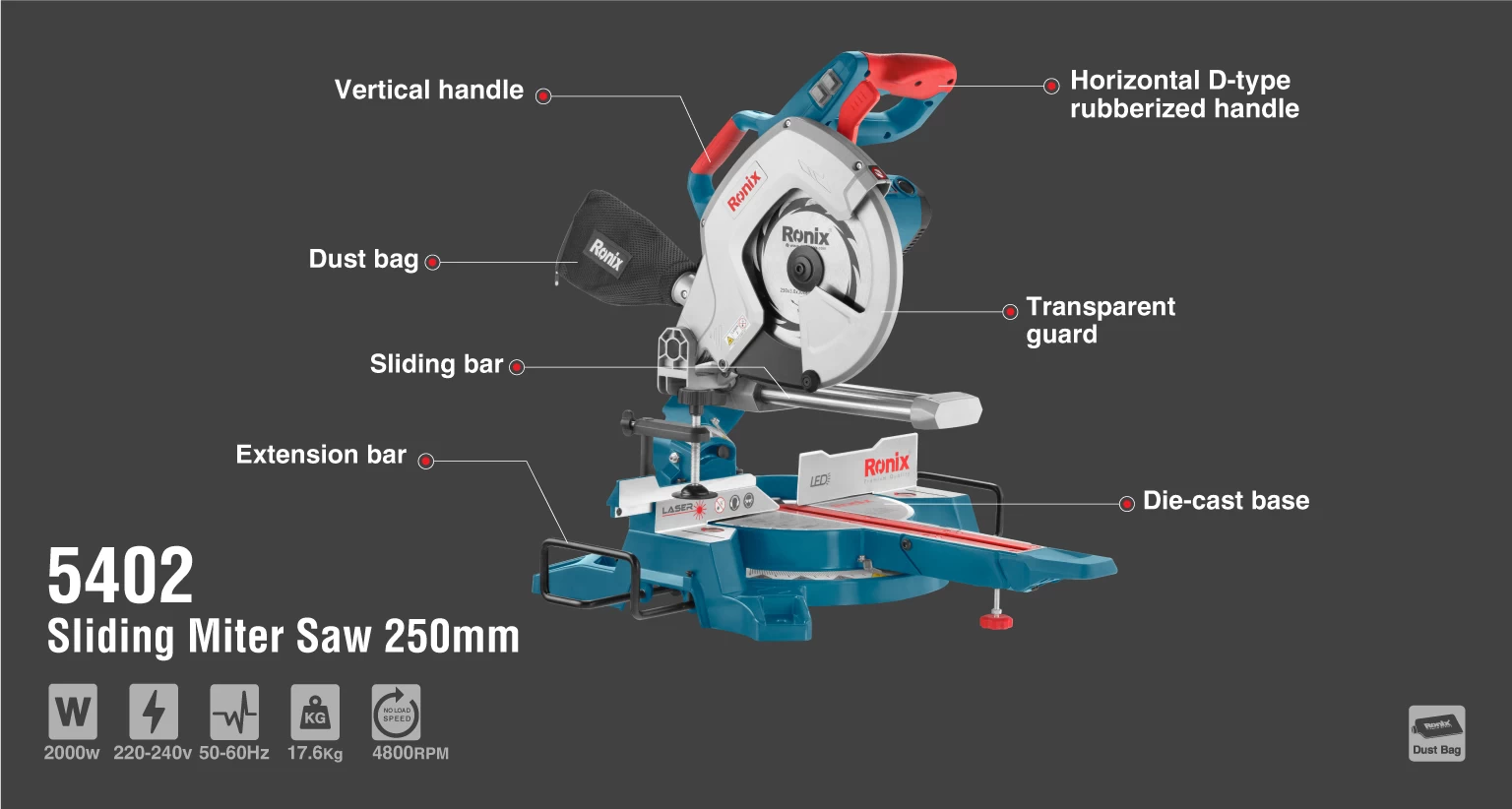 مجموعه مشخصات فنی فارسیبر کشویی 5402 رونیکس، در کنار کیفیت بالای ساخت آن، موجب افزایش کارایی، کیفیت و سرعت برش این ابزار پرکاربرد در انجام پروژههای مختلف کارگاهی و نجاری میشود. در ادامه، با ویژگیهای این دستگاه برش قدرتمند و حرفهای رونیکس بیشتر آشنا شوید.