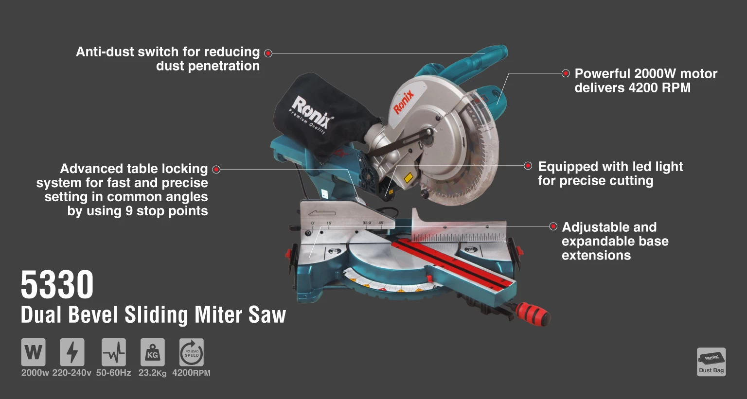 فارسیبر کشویی دوطرفه 305 میلیمتر رونیکس مدل 5330 با توان 2000 وات، ابزاری ایدهآل برای برشکاری حرفهای است. همچنین، سیستم کشویی دوبل بلبرینگ این دستگاه امکان انجام برشهای دقیق و با دامنه بالا را فراهم میکند. این فارسیبر کشویی رونیکس مجهز به سیستم نور لیزری است که دقت و سرعت برشکاری را افزایش میدهد.