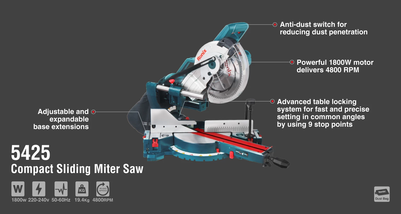 فارسیبر کشویی 250 میلیمتری مدل کامپکت 5425 رونیکس، ابزاری قدرتمند و دقیق برای برشهای زاویهدار در چوب و مواد مشابه است. این دستگاه فارسیبر با موتور 2000 واتی قدرتمند کار میکند که از آرمیچر و بالشتک صنعتی تولید شده است. ابزار برش زاویهدار 5425 رونیکس دارای تیغۀ اره الماسۀ گرد به قطر 254 میلیمتر است که امکان برشهای عمیق و گسترده را فراهم میکند. همچنین، ابعاد جمعوجور و کامپکت دستگاه امکان حمل و نقل آن را آسان میکند.