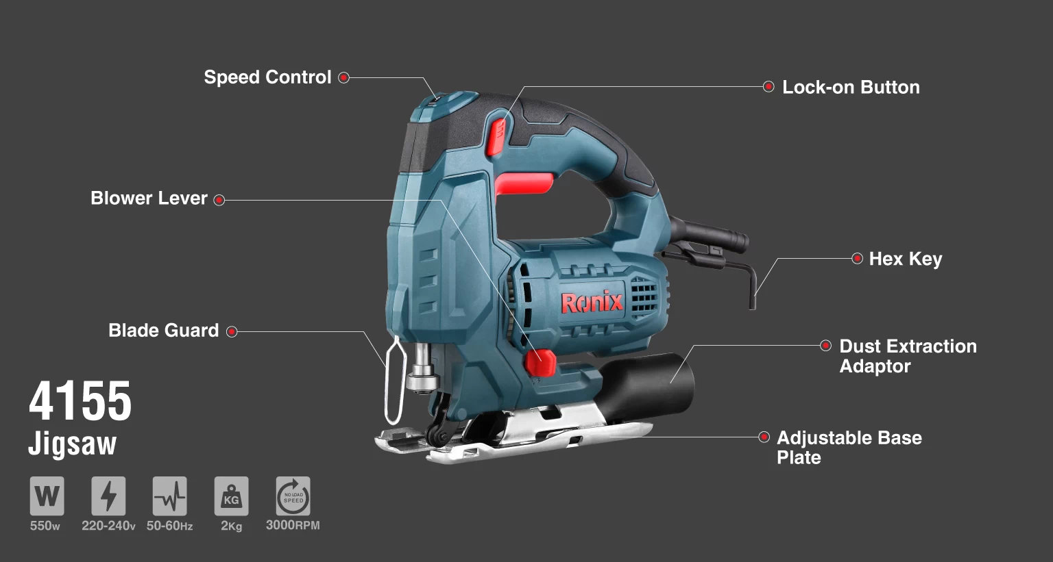 اره عمود بر 4155 رونیکس مجهز به موتوری 550 واتی است که برش چوب های ضخیم و نازک را امکان پذیر می کند. این موتور توانایی این را دارد که دور موتور را به محدوده ای از صفر تا 3000 دور بر دقیقه برساند و ماشین با تبدیل حرکت چرخشی موتور به حرکات بالا رونده و پایین رونده، عمل برش چوب را ممکن کند. همچنین لازم به ذکر است که به کمک کلید دیمر می توانید سرعت صفر تا 3000 دور بر دقیقه را بین 6 سطح متفاوت تنظیم کنید. موتور اره عمود بر 4155 همانند دیگر ابزارآلات برقی رونیکس از ولتاژ شهری 220 ولت با فرکانس 50 هرتز تغذیه می کند.