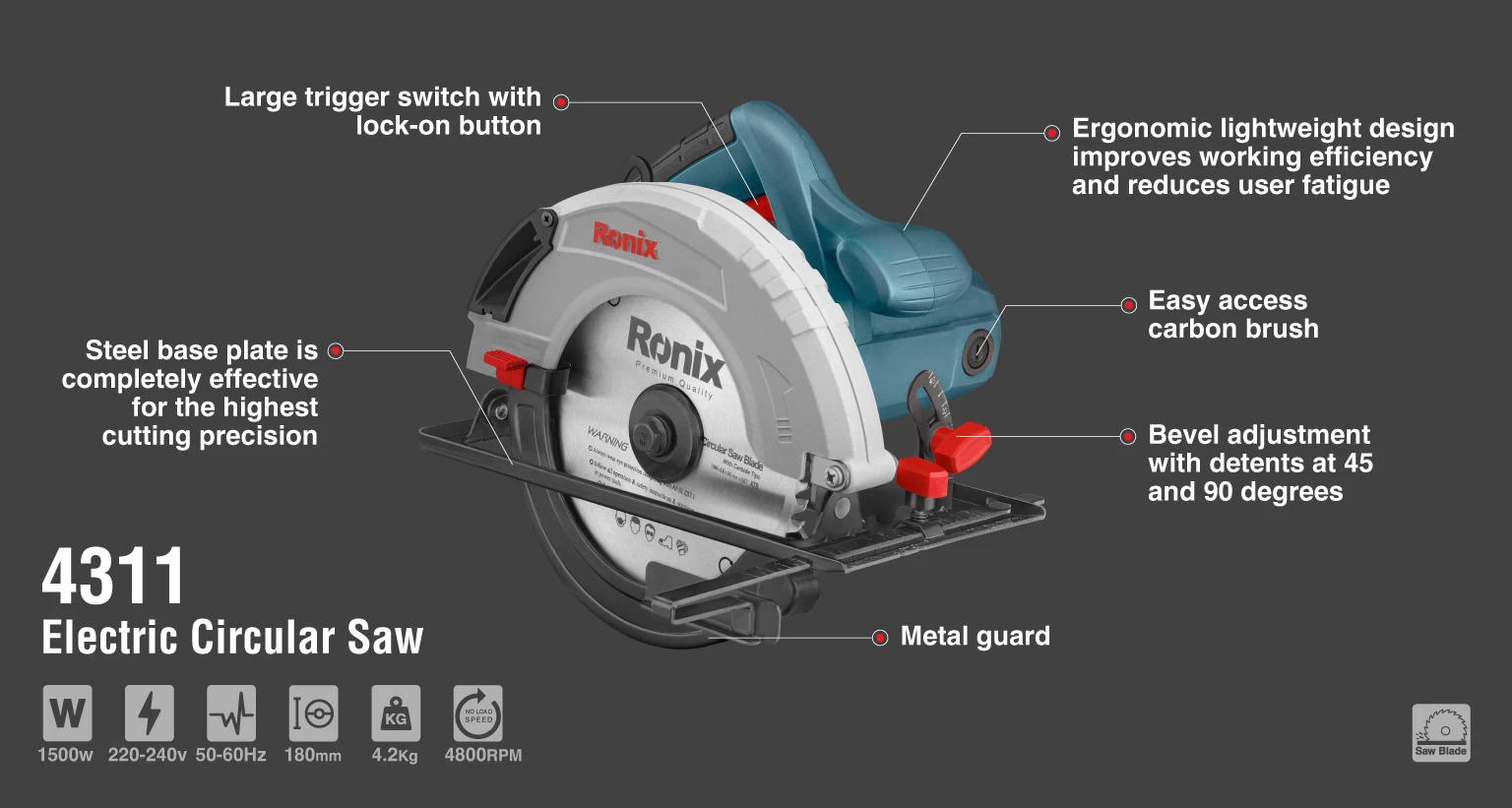 - مجهز به موتوری قدرتمند با توان 1500 وات که سرعتی بالغ بر 4800 دور در دقیقه برای ایجاد برشی سریع و دقیق فراهم میکند