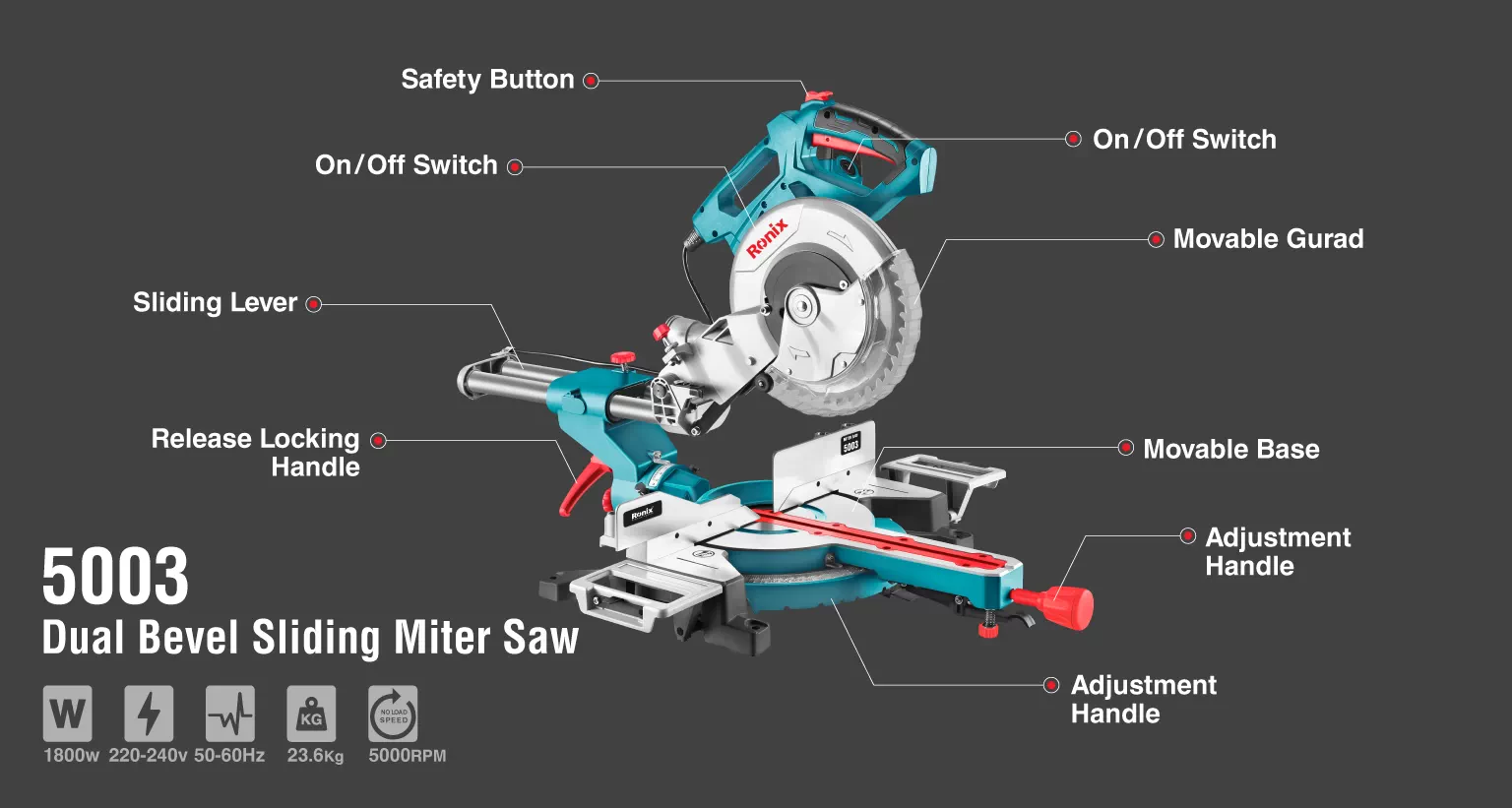 فارسیبر کشویی 5003 رونیکس یکی از ابزارهای حرفهای این مجموعه، به یک موتور قدرتمند 1800 وات و صفحه برش 255 میلیمتر مجهز است. سرعت گردش موتور در حالت آزاد بالغ بر 5000 دور بر دقیقه بوده و ابزار، با هدف افزایش ظرفیت برشکاری به ریلهای کشویی مجهز شده است.
