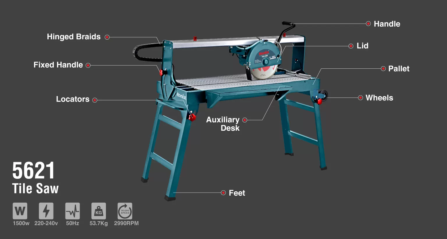 اره میزی کاشی بر 30 سانتیمتری 5621 رونیکس، ابزار برشی قدرتمندی است که به یک موتور کارآمد مجهز شده است تا بتواند قطعات مختلف سنگ و کاشی را با دقت و کیفیت بالا برش بزند. سرعت گردش تیغه در حالت آزاد بالغ با 2990 دور بر دقیقه است که صرف چرخاندن دیسک برش 300 میلیمتری این دستگاه میشود. استفاده از مواد و قطعات با کیفیت در ساخت اره میزی 5621 رونیکس، تاثیر زیادی بر کیفیت برش قطعات کار در زوایای مختلف دارد. در بخش توضیحات محصول، مشخصات فنی اره میزی کاشی بر 30 سانتیمتری رونیکس مدل 5621 را بررسی میکنیم.