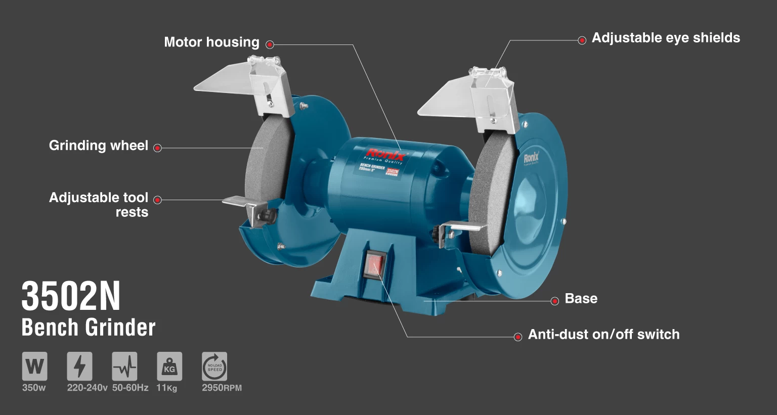 محصولی که در ادامه به معرفی و بررسی آن خواهیم پرداخت، چرخ سنباده 3502N رونیکس است. این دستگاه با دو صفحه سنباده در دو طرف و ساختاری قدرتمند، برای محیطهای کاری مختلف مناسب است. این چرخ سنباده مجهز به سنگ سنباده زبر و نرم بوده که میتوان از آن جهت کاربریهای متفاوت مانند پلیسهگیری، پرداختکاری، فرمدهی و ... استفاده نمود.
