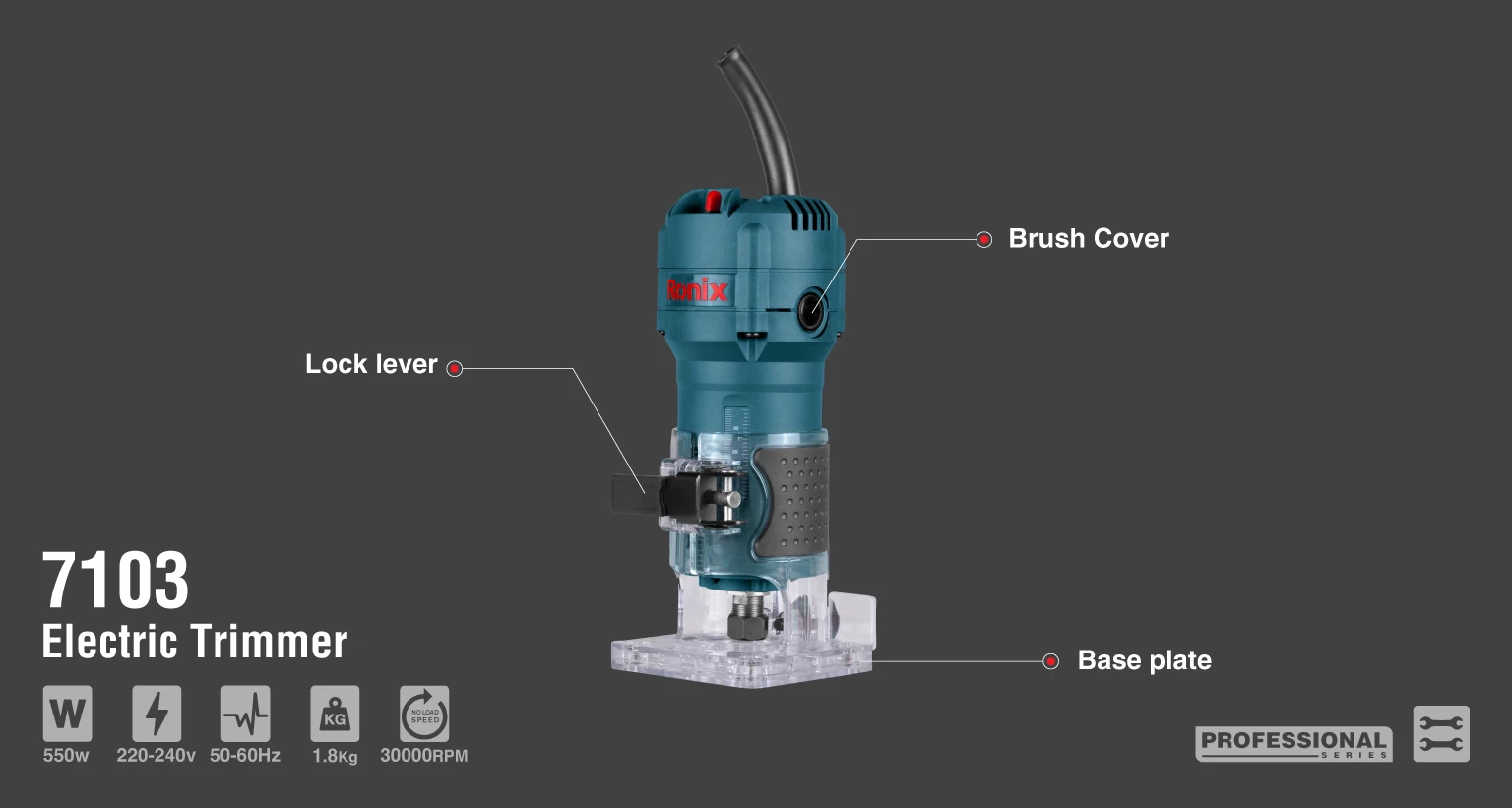لبهگیر برقی 550 وات 6 میلیمتری رونیکس مدل 7103، ابزار قدرتمند، سبک و جمعوجوری است که بهواسطه سرعت بالا و دقت در تنظیم عمق میتواند عملیات پرداخت را بهراحتی روی سطوح چوبی انجام دهد.