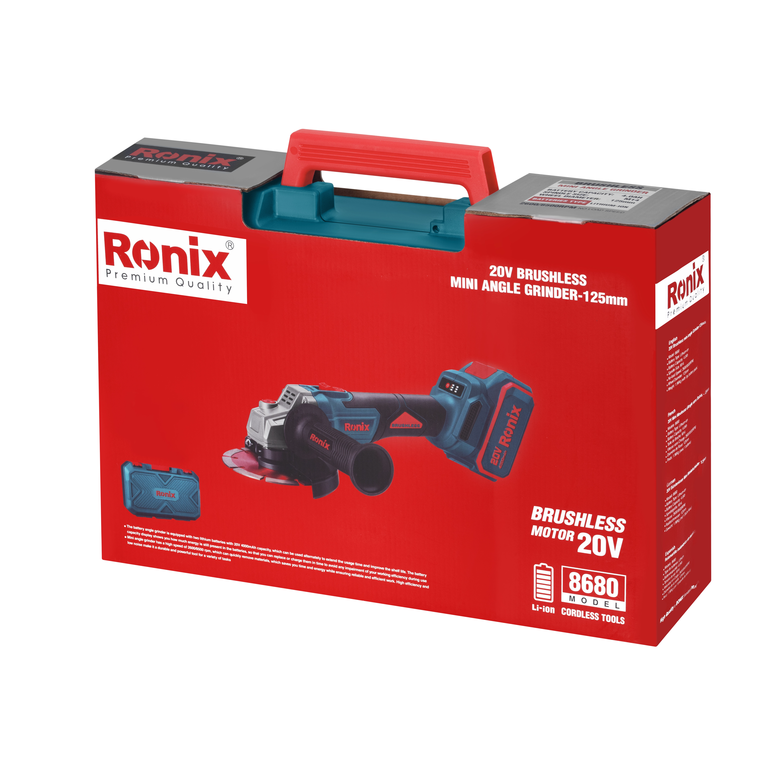 مینی فرز شارژی براشلس 20 ولت 125 میلیمتری رونیکس مدل 8680، در کیف مقاوم BMC همراه با شارژر و سایر متعلقات به بازار ابزار ایران عرضه میشود.