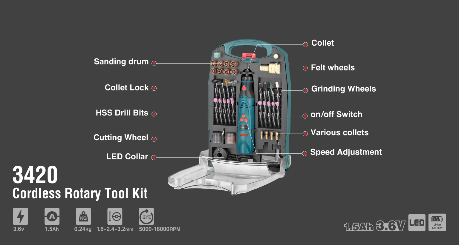 محصول 3420 رونیکس، ابزاری با طراحی ارگونومیک و بسیار سبک به وزن 0.24 کیلوگرم، کوچک و جمعوجور با قابلیت حمل و جابهجایی آسان برای کاربران است. این فرز مینیاتوری، کارایی بالایی را متناسب با انجام کارهای بسیار دقیق، ظریف و هنری اط خود نشان میدهد.