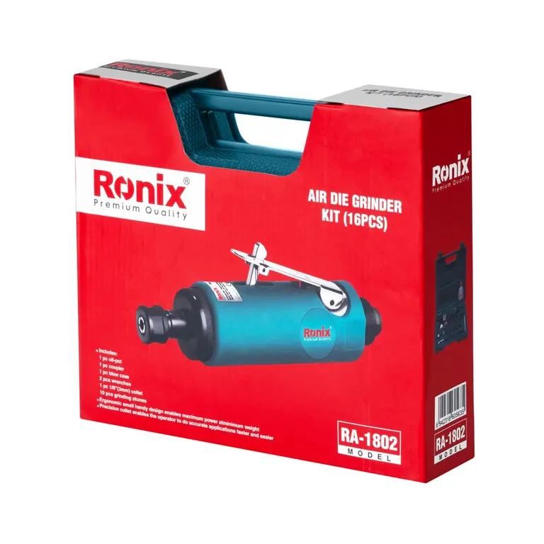 اگر به دنبال خرید فرز انگشتی بادی هستید، باید به کولت، سرعت چرخش، شفت، نوع اهرم و جنس بدنه فرز انگشتی بادی توجه ویژهای داشته باشید؛ چراکه کیفیت پایین هر کدام از این موارد میتواند بر عملکرد دستگاه تاثیر بگذارد. برندهای زیادی تولیدکننده فرز انگشتی بادی در ایران هستند؛ به همین دلیل انتخاب بهترین این ابزار در بین آنها کار دشواری است. در ادامه به بررسی کیت فرز انگشتی بادی 16 پارچه رونیکس مدل RA-1802 میپردازیم تا با ویژگیهای فرز انگشتی بادی باکیفیت جهانی بیشتر آشنا شوید.
