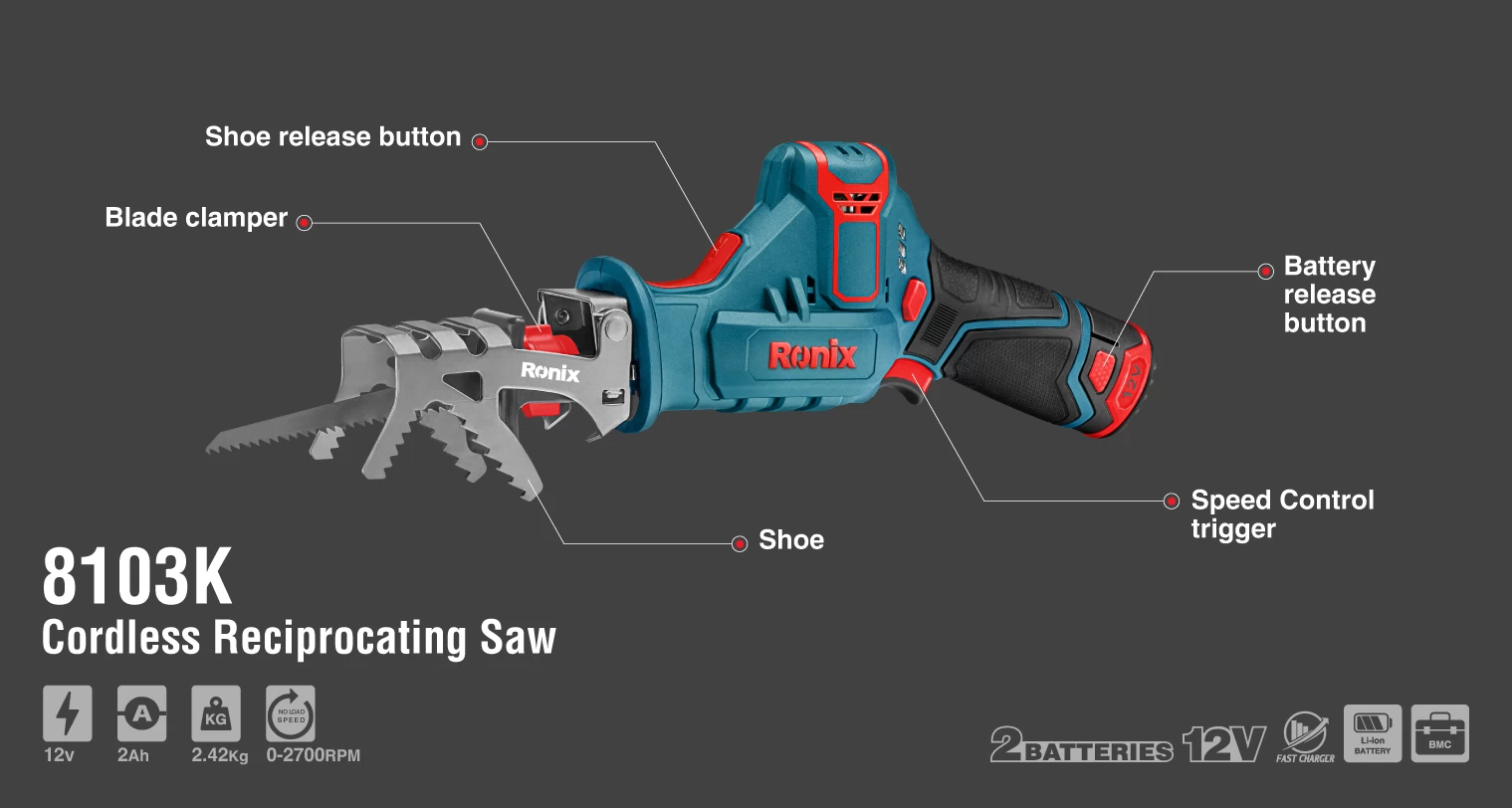 طراحی اره همهکاره یا افقیبر شارژی 8103K رونیکس و ساختار لولهایشکل آن، استفاده از این ابزار را در فضاهای با دسترسی محدود امکانپذیر میکند. این اره به یک موتور 12 ولت DC کوچک اما قدرتمند و با راندمان بالا تجهیز شده است. در این محصول شارژی، از باتری لیتیوم یون 12 ولت با ظرفیت 2 آمپرساعت به عنوان منبع تغذیه استفاده میشود. ابزارگیر این اره افقیبر، اتوماتیک بوده و تعویض سریع و آسان تیغه را برای کاربر امکانپذیر میکند. افزونبراین، در قسمت بالایی این ابزارگیر، میتوان پایهای را برای باغبانی و شاخهزنی نصب کرد.