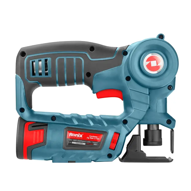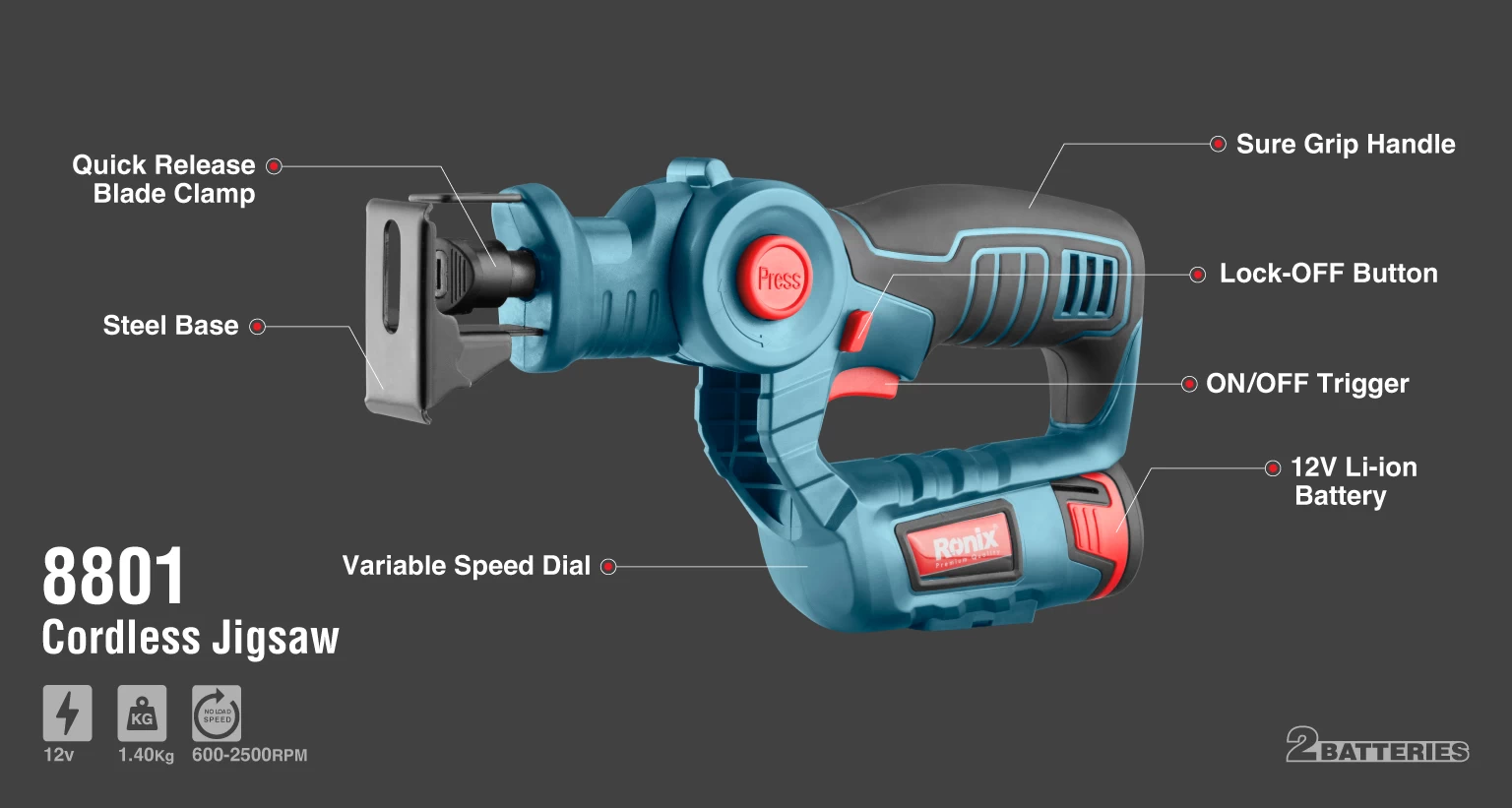 اره شارژی رونیکس 8801 یک اره قدرتمند و بادوام است که برش کارآمدتر و بهتری را انجام میدهد. باتری این دستگاه از نوع لیتیومی سامسونگ است، که طول عمر بیشتر و زمان شارژ کمتری دارد. دستگیره این اره به صورت ارگونومیک طراحی شده و از لاستیک نرم برای کاهش خستگی کاربر در حین استفاده و ایجاد راحتی بیشتر استفاده شده است. یک سوئیچ قفل امنیتی در پایین دستگاه ارائه شده است. همچنین میتوانید از یک گونیا برای تنظیم دستگاه در سمت افقی و عمودی استفاده کنید. این دستگاه دارای یک موتور قدرتمند و بادوام است که اثربخشی برش را با محدوده سرعت بدون بار 600 تا 2500 دور بر دقیقه فراهم میکند، و برای کارهای سبک یا سنگین کافی است. به دلیل شارژی بودن، رونیکس 8801 دارای یک باتری به عنوان منبع تغذیه بوده و مجهز به باتری سامسونگ با ولتاژ 12 ولت و ظرفیت 1.5آمپر ساعت است. تکنولوژی این باتری بر مبنای یون لیتیوم است تا دوام و طول عمر بیشتری داشته باشد. قابلیت شارژ سریع ویژگی بعدی این اره رونیکس است که البته یک گزینه خاموشی خودکار برای حفاظت از باتری نیز دارد. طراحی دستگیره ارگونومیک این اره رونیکس شامل یک لاستیک نرم است که خستگی کاربر را کاهش داده، و برای اپراتور راحتی بیشتری را به همراه می آورد. وزن این اره الکتریکی 1.40 کیلوگرم است و بنابراین به اندازه کافی سبک بوده که سبب خستگی کاربر نمیشود. طول رفت و برگشت این اره 14 میلی متر است که انواع گسترده ای از قطرها را پوشش میدهد و تیغه آن بدون گیر کردن و به راحتی حرکت میکند. عملکردهای دکمه ها روی بدنه این اره متفاوتند. یک دکمه برای روشن کردن موتور اره و آماده سازی آن برای استفاده تعبیه شده است. سپس میتوان با یک دیمر سرعت کار کردن ابزار را تنظیم کرد. رونیکس 8801 دارای یک جعبه رنگی است، که شامل یک کیف کوچک برای حمل ابزارتان، دو باتری برای زمانی که یکی از آنها خراب شد، یک شارژر برای شارژ باتری ها، و دو لبه طراحی شده برای برش MDF و یا فلز است، به طوری که بتوان با کمک آن کارهای مختلفی را انجام داد.