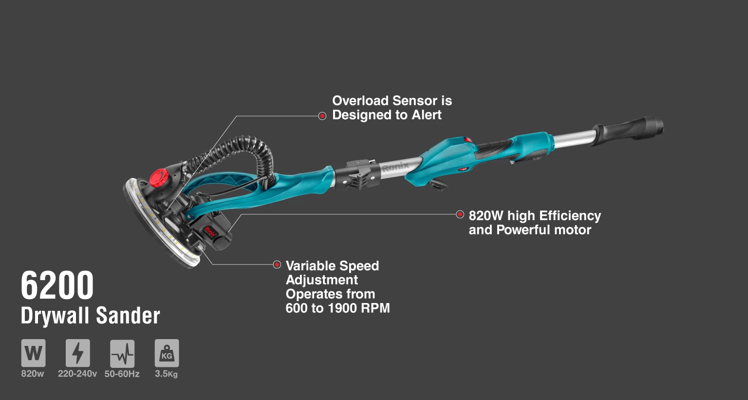 دستگاه سنبادهزن دیواری 820 وات رونیکس مدل 6200، برای سنبادهزنی و پرداخت سقف و دیوار طراحی و تولید میشود. استفاده از این ابزار، سطوح یکنواخت و صافی را ایجاد میکند که آماده رنگکاری نهایی هستند.