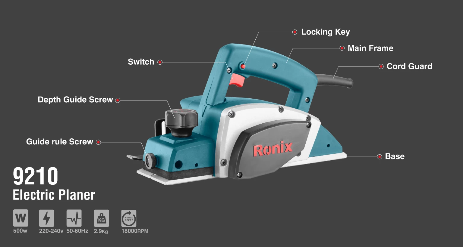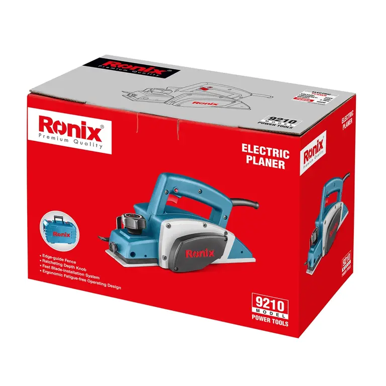 رنده برقی رونیکس مدل 9210 از ابزارهای برقی این کمپانی است که با ولتاژ 220 ولت برق شهری کار می کند. این دستگاه گزینه ای ایده آل برای نجاری و سنباده زدن و رنده کردن قطعات چوبی می باشد. رنده برقی 9210 به یک موتور 500 واتی قدرتمند مجهز شده که می تواند سرعتی بالغ بر 18000 دور در دقیقه تولید کند.