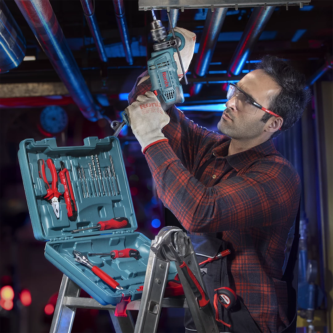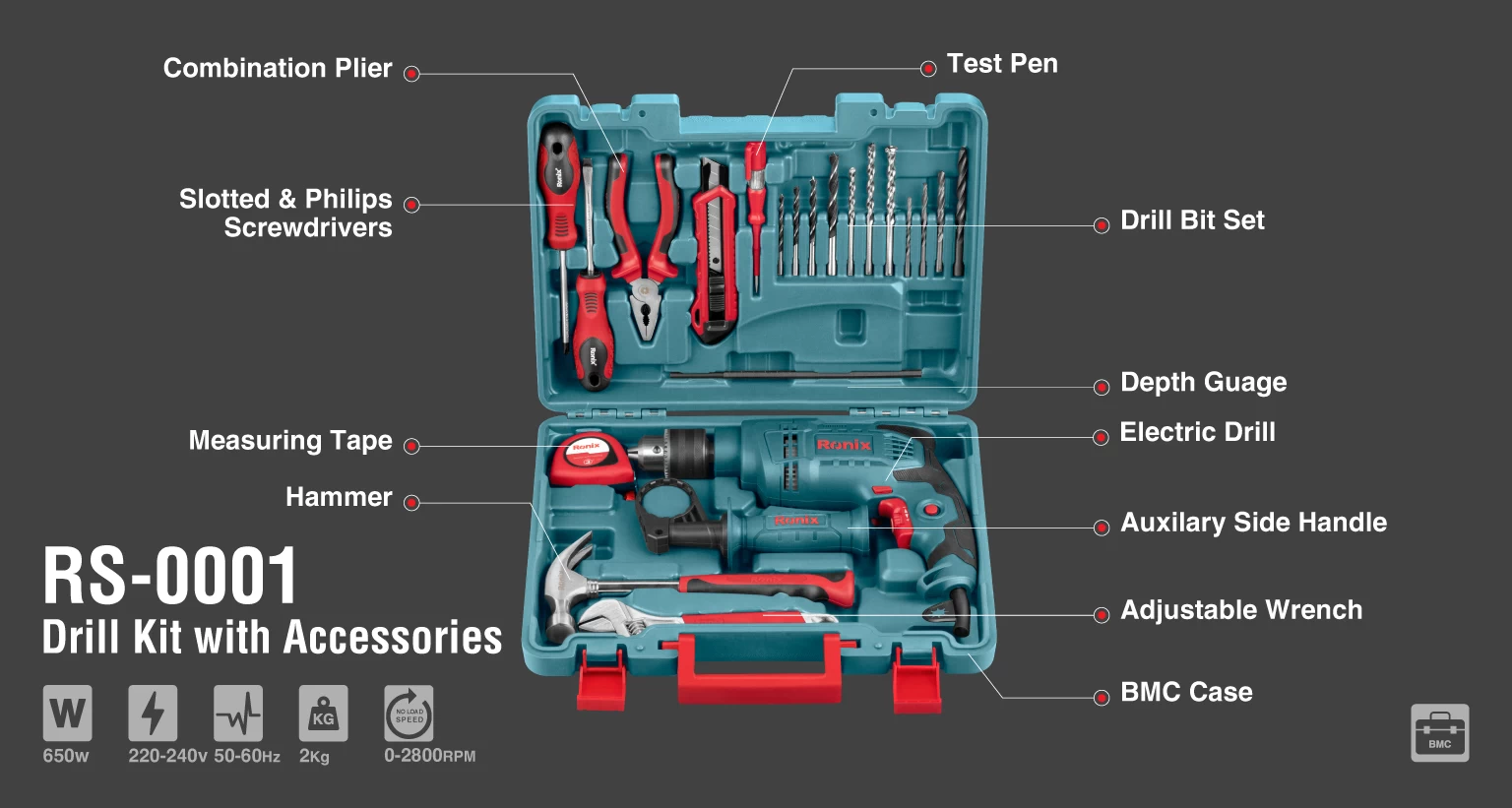 کیت دریل رونیکس مدل RS-0001، مجموعه کاملی از یک دریل چکشی و انواع مختلف ابزارهای دستی به همراه سریهای مته رونیکس با سایزهای متفاوت است که در داخل یک کیف ضد ضربه BMC بستهبندی شده است. دریل موجود در این کیت، مجهز به یک موتور 650 واتی بسیار مقاوم برای بهترین کارایی در سوراخکاری و دریلکاری چکشی است و میتواند سرعتی بالغ بر 2800 دور در دقیقه را ایجاد کند.