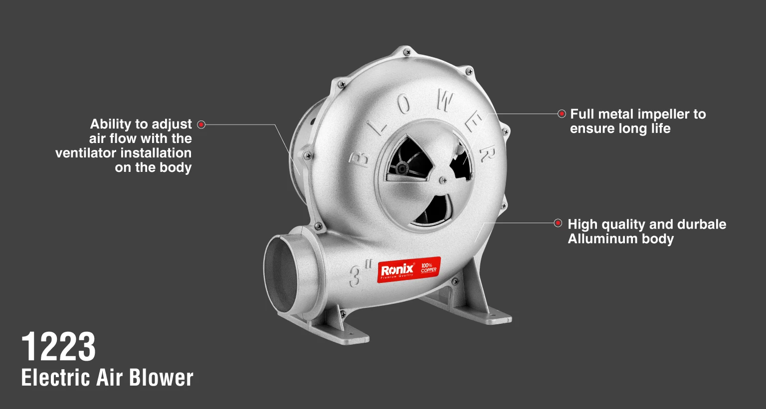 این دم برقی صنعتی که به دمنده یا بلوور برقی نیز معروف است، مجهز به موتور 370 واتی، کم صدا و بدون لرزش است. این دستگاه مجهز به بدنه ای از جنس آلومینیوم مقاوم و با کیفیت، پروانه تمام فلزی و سیم پیچی %100 مسی بوده و پایه های پهن، محکم و بادوام آن قابلیت نصب بر روی میز جهت استقرار بهتر را دارد. در ضمن مدل 1223 رونیکس مجهز به خروجی هوا با قطر 3 اینچ و وزن 4.6 کیلوگرم می باشد.