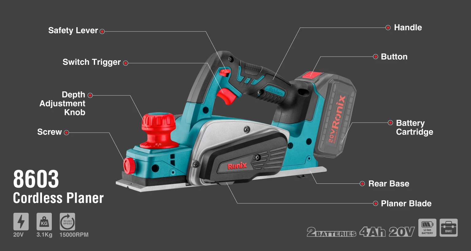رنده نجاری شارژی 20 ولت 8603 رونیکس، برای حذف ناهمواریهای سطح چوب پس از برش و ایجاد سطوح یکدست مورد استفاده قرار میگیرد. این ابزار در پروژههای نجاری، تعمیر درب، لبهگیری و اصلاح سطوح چوبی مختلف کاربرد دارد. رنده شارژی نجاری 8603 رونیکس، با موتور قدرتمند خود، سرعتی بالغ بر 15000 دور در دقیقه را ایجاد میکند.