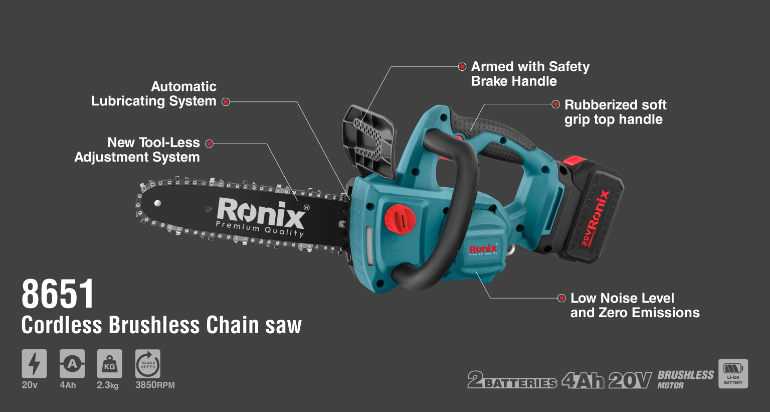 طراحی خاص این اره درختبر رونیکس، شامل موتور حرفهای، سیستم محافظ اضافه بار، سیستم تنظیم کشش زنجیر و ... میشود. اره زنجیری شارژی 20 ولت 25 سانتیمتر 8651 رونیکس، از یک سوئیچ ایمنی و سیستم روغنکاری خودکار زنجیر نیز بهره میبرد.