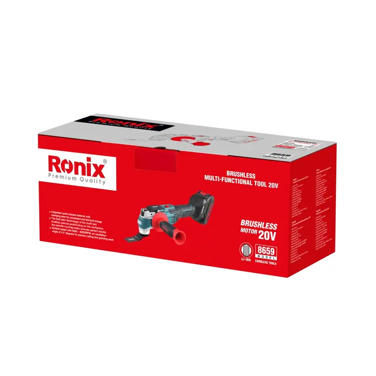 موتور قدرتمند DC و براشلس فرز همهکاره شارژی 8659 رونیکس با قابلیت ایجاد لرزش 20000 دور بر در دقیقه، کنترل سرعت و ایجاد سرعت پایدار در حین کار، باعث شده تا بتوانید از دستگاه برای کاربردهایی نظیر برشکاری، سنبادهزنی، تراشیدن، تمیزکاری و همسطحسازی مواد مختلف استفاده کنید.