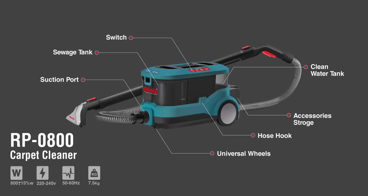 این فرششوی رونیکس به دلیل بدنه سبک، مقاوم و قدرت مکش زیاد میتواند انواع سطوح و لکهها را از بین ببرد. همچنین حجم اسپری این دستگاه 300 الی 400 میلیلیتر در دقیقه است. در ادامه، به بررسی ویژگیهای فرششوی و مبلشوی 800 وات مدل RP-0800 خواهیم پرداخت.