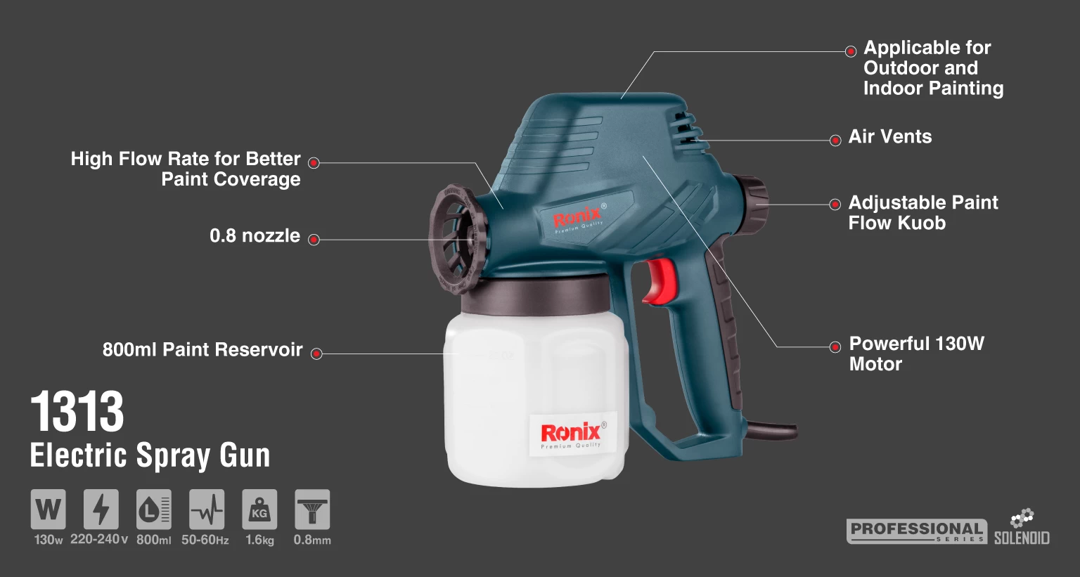 پیستوله رنگپاش برقی 1313 رونیکس، ابزاری حرفهای و کاربردی است که از آن برای رنگآمیزی و نقاشی سطوح مختلف استفاده میشود. این ابزار با ذخیره هوا در مخزن خود، تبدیل آن به ذرات پودرشده و سپس ذرات رنگی، پاشش دقیق و یکنواختی را در سطوح مختلف ایجاد میکند.