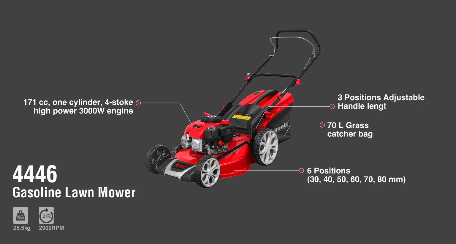 چمنزن بنزینی 4446 رونیکس به دلیل استفاده از سوخت بنزین، کارایی بالاتری نسبت به چمنزن الکتریکی دارد و دیگر لازم نیست برای کوتاه کردن چمنها، دستگاه را به برق متصل کنید. در نتیجه، این دستگاه در هر مکانی قابل استفاده است.