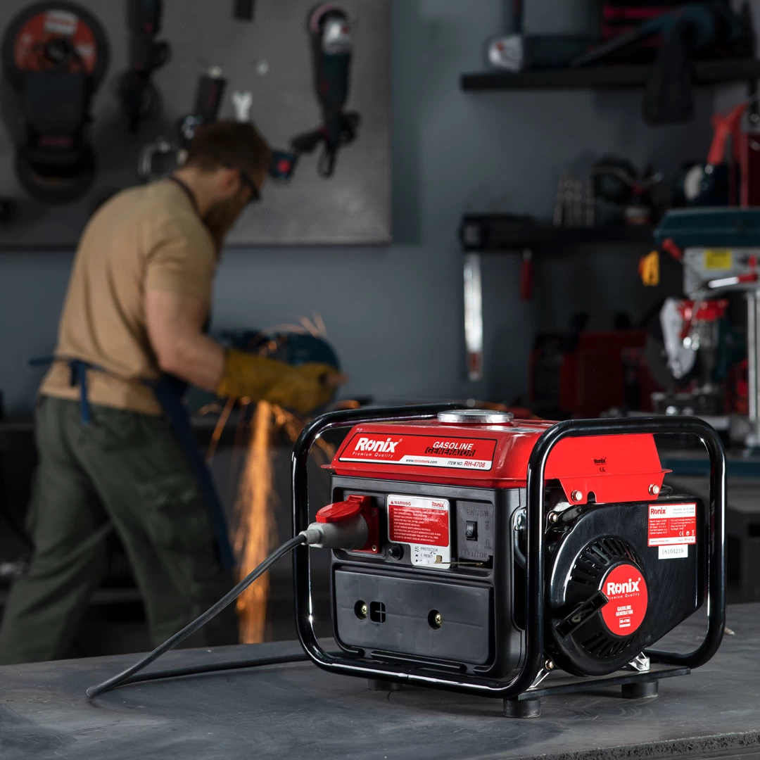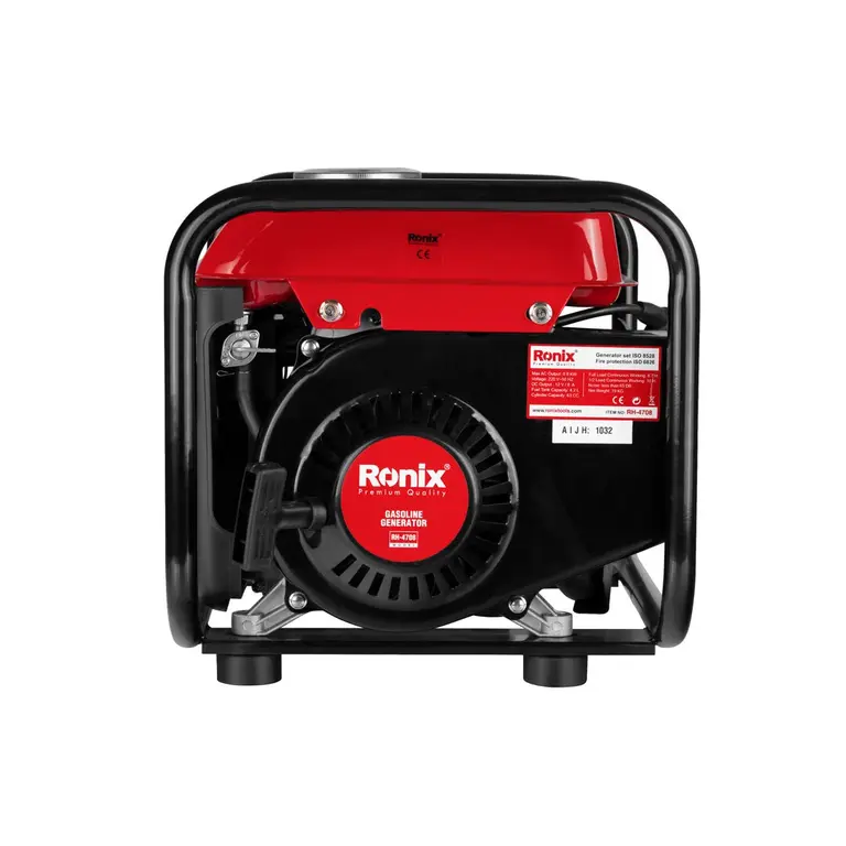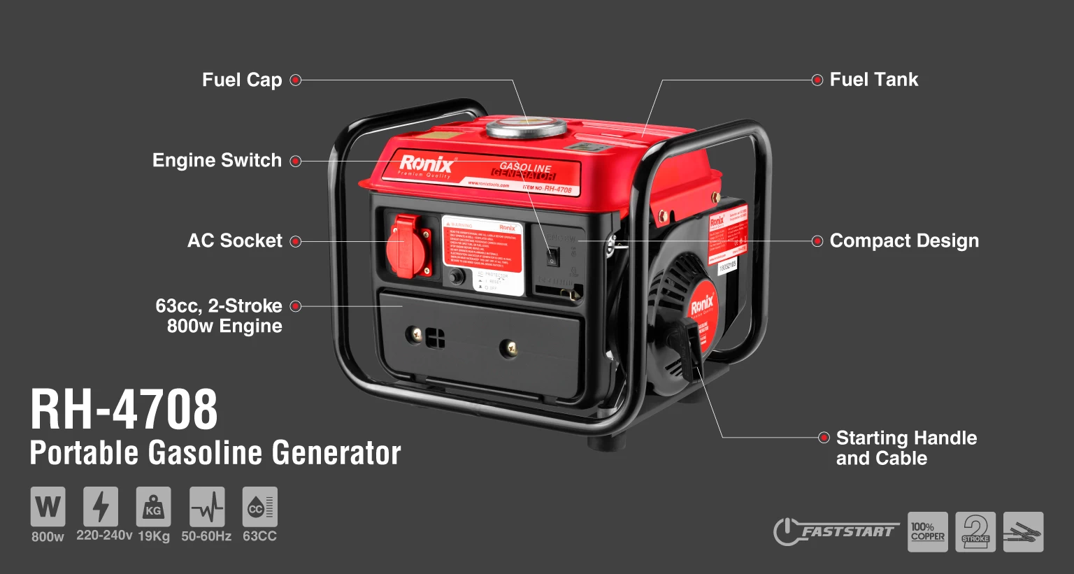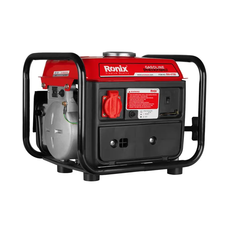 ژنراتور تکفاز بنزینی RH-4708 رونیکس، دارای یک موتور تکسیلندر و 2 زمانه با حداکثر خروجی توان 800 وات است که به صورت هندلی یا دستی استارت میخورد.