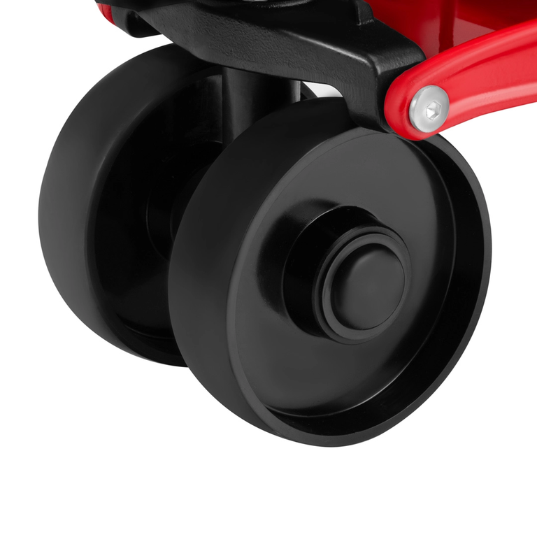 چرخهای فرمان فولادی این جک پالت، با پوشش پلییورتان بسیار عریض پوشانده شده است. همچنین، چرخهای بار نایلونی دارای یاتاقانهای روغنکاری شده و کاملاً مهر و موم شده هستند تا جابهجایی نرم، بیصدا و پایداری بیشتری ایجاد شود. قطر چرخهای فرمان، 180 میلیمتر بوده و قطر چرخهای بار 74 میلیمتر است.