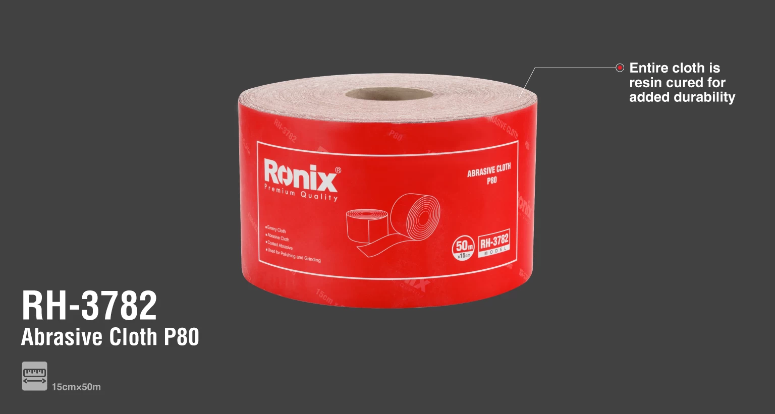 طول و عرض سنباده رول 3782-RH رونیکس، به ترتیب برابر با 50 متر و 15 سانتیمتر است. پولیش قطعات کار با جنسهای مختلف، پلیسهگیری، پرداخت قطعات چوبی و فلزی بعد از عملیات ماشینکاری، برداشتن زنگار و رسوبزدایی بخشهای داخلی قطعه کار، سنبادهزنی، پرداخت سطوح رنگکاریشده و ... با کمک رول سنباده 80P رونیکس انجام میشود. رنگ این رول، قرمز مایل به قهوهای است؛ همچنین دانهبندی آن شمارهی 80 است.