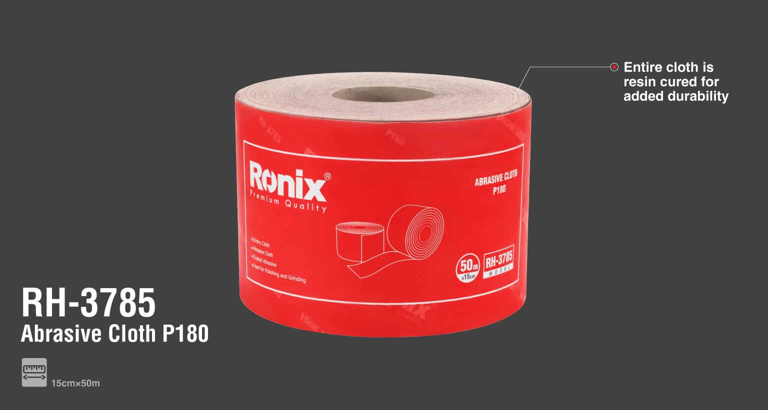 طول و عرض سنباده رول 3785-RH رونیکس، به ترتیب 50 متر و 15 سانتیمتر است. این سنباده با گرید 180، نرم بوده و برای پولیش و پرداخت نرم و تمیز قطعات چوبی و فلزی بعد از ماشینکاری، برداشتن زنگار رنگ، زنگزدگی و رسوب از بخشهای داخلی قطعه کار، سنبادهزنی، پرداخت سطوح رنگکاریشده و مصارف اینچنینی کاربرد دارد. این رول به رنگ قرمز مایل به قهوهای است؛ همچنین درجهبندی آن، شمارهی 180 است.