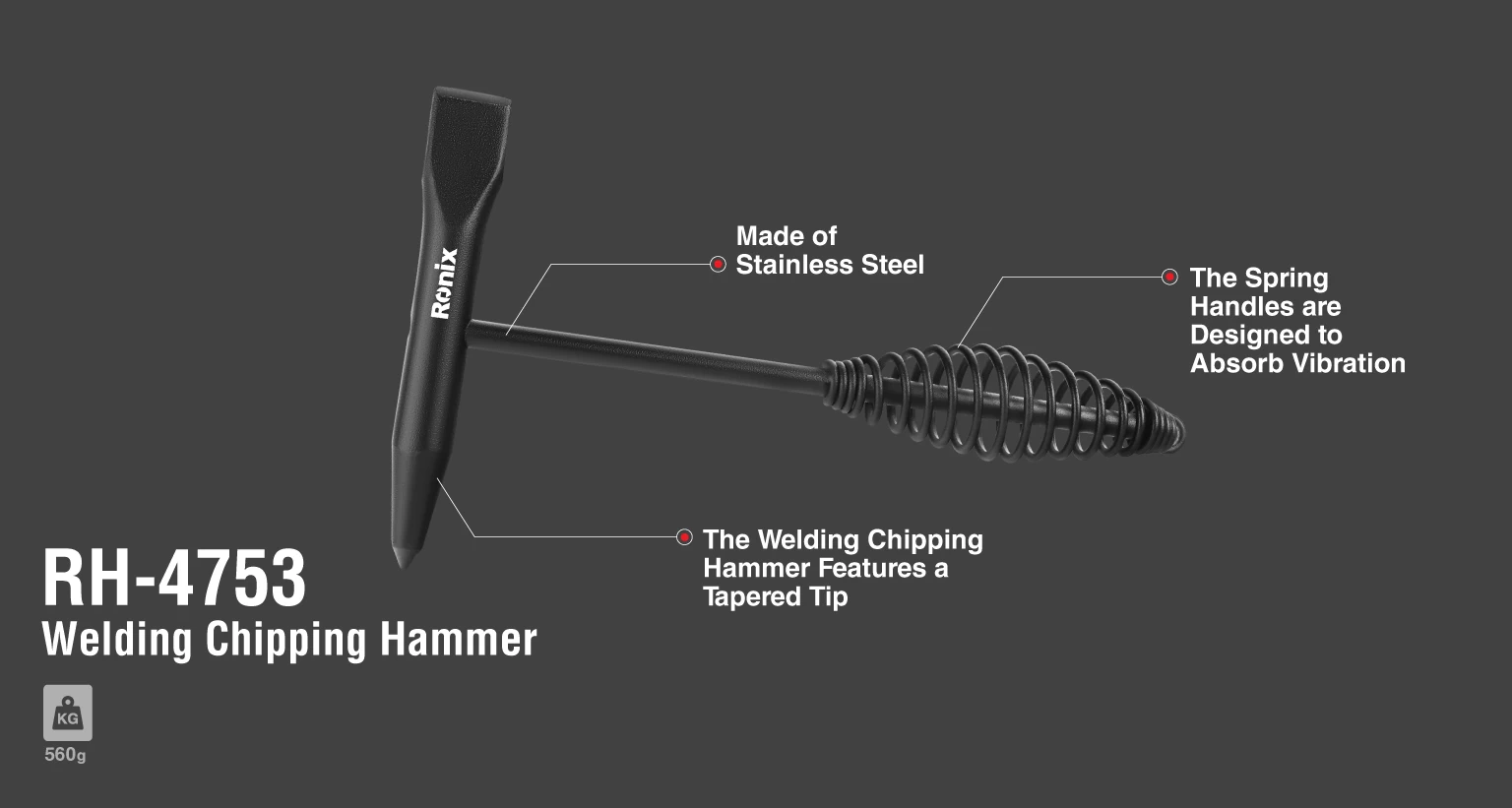 1- دارای نوک مخروطی شکل بسیار کار آمد که می توان از آن در موارد مختلف از جمله جوشکاری، تعمیرات ساختمانی و.. به راحتی استفاده کرد. 2- دارای دسته ی فنری شکل که خاصیت ضد لرزشی جهت راحتی کاربر وجلوگیری از آسیب رسیدن به دست را ایجاد میکندو همچنین میتوان به راحتی آن را جای مناسب آویزان کرد 3- ساخته شده ازاستیل ضدزنگ که دارای کیفیت و مقاومت بالا در عین حال طراحی ظریفی بوده و بطور کلی تکنولوژی فورجینگ در آن بخوبی انجام شده و بسیار محکم و با دوام و دارای عمر طولانی می باشد 4- طراحی منحصر به فرد آن که استفاده از این چکش را برای مکانهایی که دسترسی به آنجا دشوار است را آسان می کند.