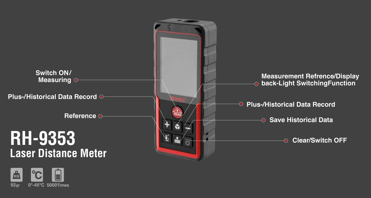 رونیکس انواع متر لیزری را مانند سایر ابزارآلات خود با تنوع بینظیر و کیفیت متفاوت تولید کرده و آنها را روانه بازار ابزار ایران و جهان میکند. متر لیزری RH-9353 رونیکس تنها نمونهای از این تنوع بی حد و اندازه است. این محصول پرکاربرد، برای اندازهگیری و فاصلهیابی دقیق نقاط مختلف مورد استفاده قرار میگیرد.