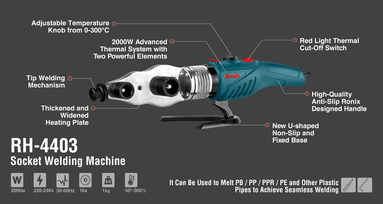 اتو لوله سبز RH-4403 رونیکس مجهز به یک موتور 2000 واتی قدرتمند بوده و قابلیت تنظیم درجه حرارت در این ابزار، از 50 تا 300 درجه سانتیگراد متغیر است. این محدوده دمایی بالا موجب میشود که قطورترین لولههای متناسب با این ابزار نیز به راحتی و به سرعت جوش داده شوند. اتو لوله RH-4403 رونیکس، از این جهت دستگاه جوش لوله سبز گوشهزن نامیده میشود که در قسمت انتهایی راکت خود دارای سوکتی است که جوشکاری در محیطهای محصور با دسترسی دشوار را برای ترمیم و تعمیر لولههای فرسوده امکانپذیر میکند.