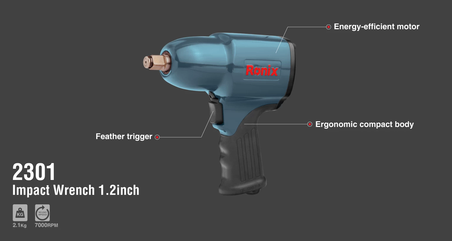 بکس بادی 1/2 اینچ 2301 رونیکس، انرژی مورد نیاز خود را از کمپرسور باد تامین میکند. این ابزار بادی، مجهز به موتوری کممصرف و مکانیزم پین کلاچ است و برای انجام کاربریهایی مانند تعمیر موتورهای کوچک، کامیونهای سبک، تعمیرات خودرو، خط تولید کارخانهها، تعمیر ماشینآلات کشاورزی و ... انتخاب ایدهآلی است. این دستگاه بادی کوچک اما قدرتمند، قادر است گشتاوری بالغ بر 570 نیوتنمتر را تولید کند.