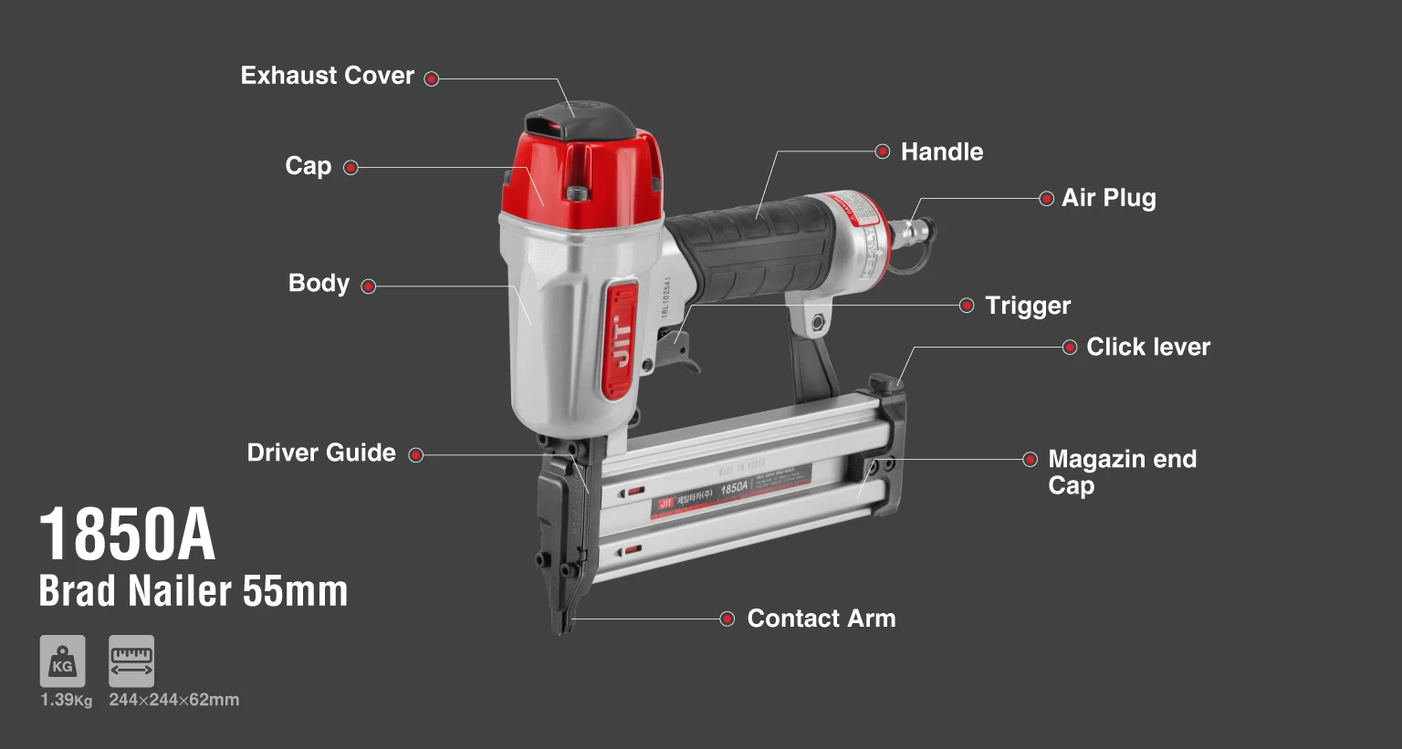 این محصول، ابزاری بادی است که با اتصال به پمپ باد و ذخیره و هدایت هوای فشرده کار میکند. فشار کاری در این میخکوب بین 4 تا 7 kgf/cm2 و حداکثر فشار 157 پوند بر اینچ مربع است.