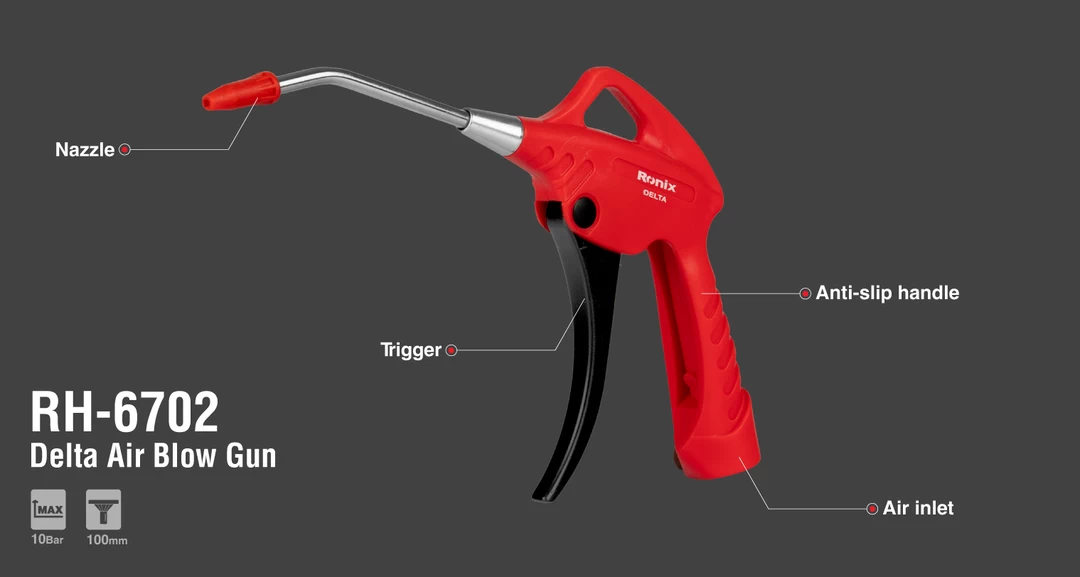 تفنگ بادپاش دلتا مدل RH-6702 رونیکس با فشاری بالغ بر 10 بار کار میکند و برای غبارزدایی و رسوبزدایی از روی سطوح مختلف مانند خودرو و ... مناسب است.